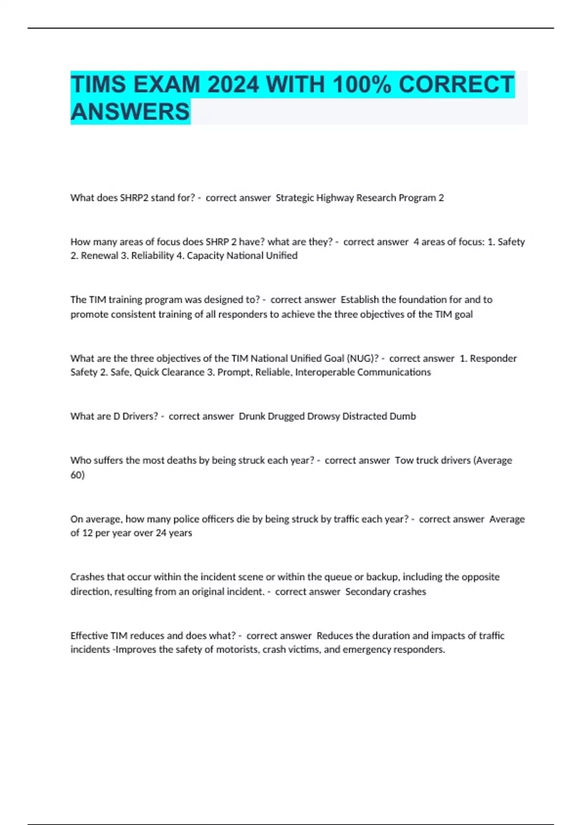 TIMS EXAM 2024 WITH 100% CORRECT ANSWERS What does SHRP2 stand for? - correct answer Strategic Highway Research Program 2 How many areas of focus does SHRP 2 have? what are they? - correct answer 4 areas of focus: 1. Safety 2. Renewal 3. Reliability 4. Capacity National Unified The TIM training program was designed to? - correct answer Establish the foundation for and to promote consistent training of all responders to achieve the three objectives of the TIM goal What are the three objectives of the TIM National Unified Goal (NUG)? - correct answer 1. Responder Safety 2. Safe, Quick Clearance 3. Prompt, Reliable, Interoperable Communications What are D Drivers? - correct answer Drunk Drugged Drowsy Distracted Dumb Who suffers the most deaths by being struck each year? - correct answer Tow truck drivers (Average 60) On average, how many police officers die by being struck by traffic each year? - correct answer Average of 12 per year over 24 years