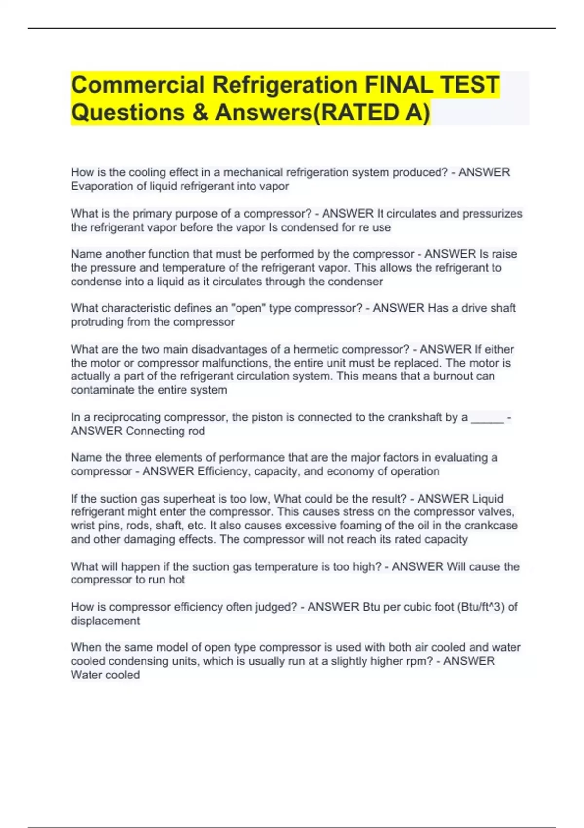 Commercial Refrigeration FINAL TEST Questions & Answers(RATED A)
