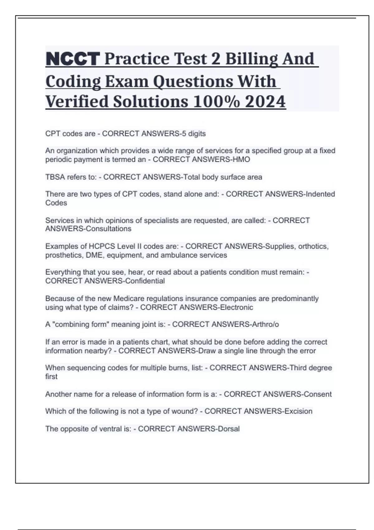 NCCT Practice Test 2 Billing And Coding Exam Questions With Verified Solutions 100% 2024