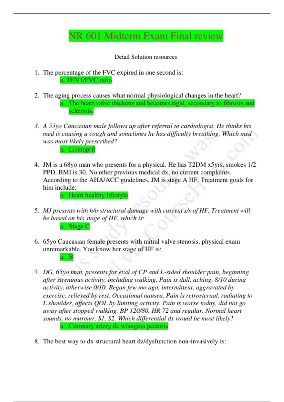 NR 601 Midterm Exam Final review Detail Solution resources 1. The percentage of the FVC expired in one second is: a. FEV1/FVC ratio 2. The aging process causes what normal physiological changes in the heart? a. The heart valve thickens and becomes rigid, secondary to fibrosis and sclerosis. 3. A 55yo Caucasian male follows up after referral to cardiologist. He thinks his med is causing a cough and sometimes he has difficulty breathing. Which med was most likely prescribed? a. Lisinopril 4. JM is a 68yo man who presents for a physical. He has T2DM x5yrs, smokes 1/2 PPD, BMI is 30. No other previous medical dx, no current complaints. According to the AHA/ACC guidelines, JM is stage A HF. Treatment goals for him include: a. Heart healthy lifestyle 5. MJ presents with h/o structural damage with current s/s of HF. Treatment will be based on his stage of HF, which is: a. Stage C 6. 65yo Caucasian female presents with mitral valve stenosis, physical exam unremarkable. You know her stage of HF is: a. B 7. DG, 65yo man, presents for eval of CP and L-sided shoulder pain, beginning after strenuous activity, including walking. Pain is dull, aching, 8/10 during activity, otherwise 0/10. Began few mo ago, intermittent, aggravated by exercise, relieved by rest. Occasional nausea. Pain is retrosternal, radiating to L shoulder, affects QOL by limiting activity. Pain is worse today, did not go away after stopped walking. BP 120/80, HR 72 and regular. Normal heart sounds, no murmur, S1, S2. Which differential dx would be most likely? a. Coronary artery dz w/angina pectoris 8. The best way to dx structural heart dz/dysfunction non-invasively is: