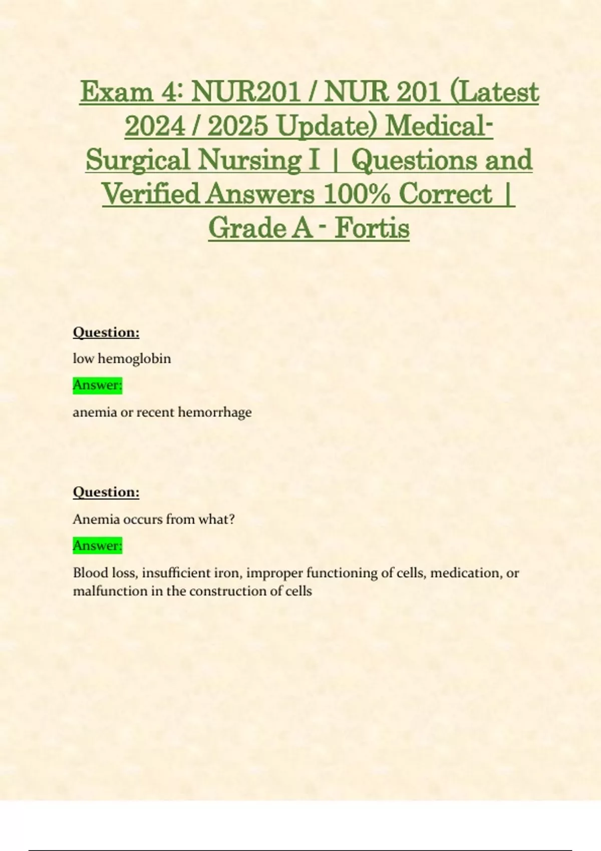 Exam 4: NUR201 / NUR 201 (Latest 2024 / 2025 Update) Medical-Surgical Nursing I | Questions and Verified Answers 100% Correct | Grade A - Fortis