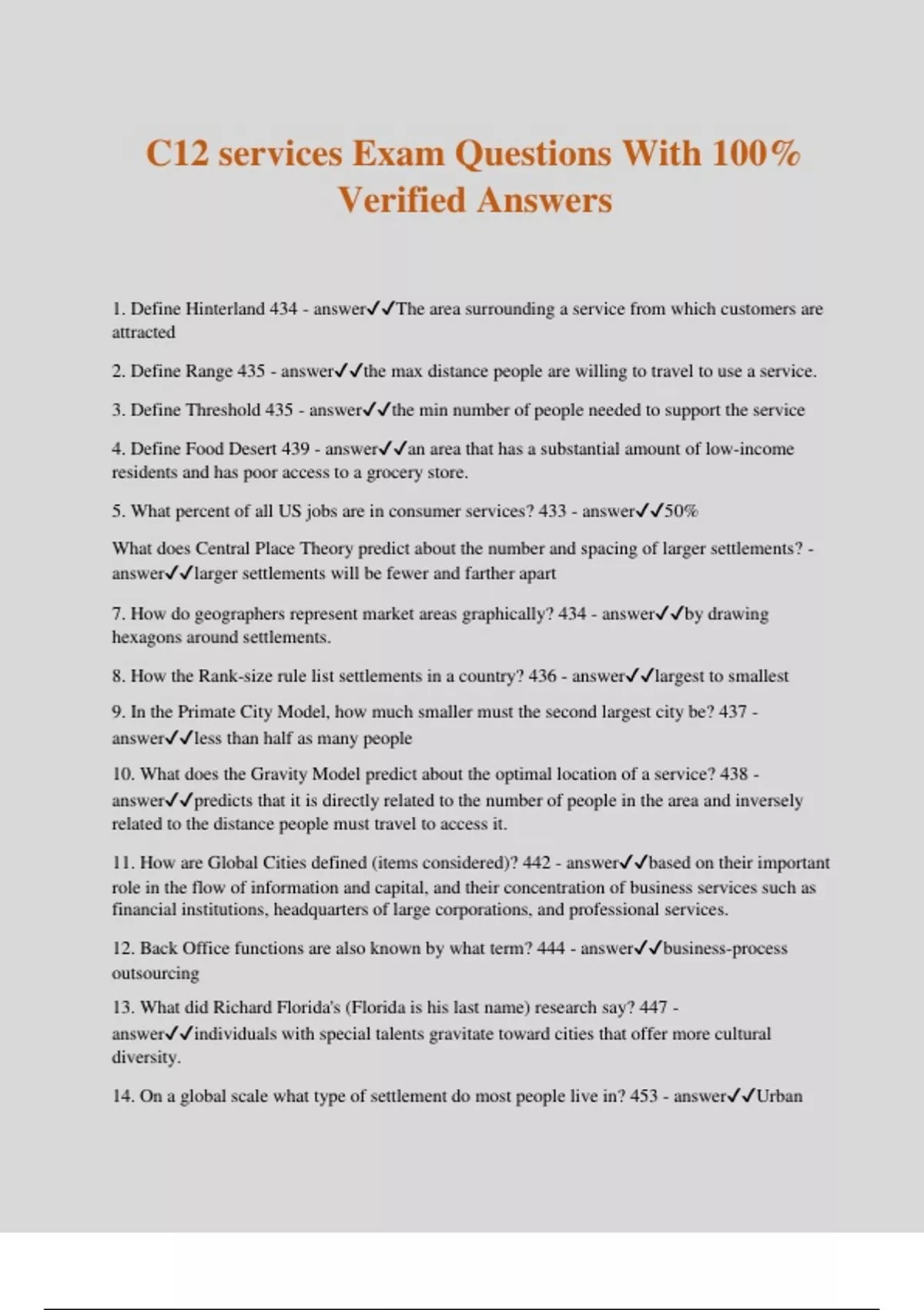 C12 services Exam Questions With 100% Verified Answers 1. Define Hinterland 434 - answerThe area surrounding a service from which customers are attracted 2. Define Range 435 - answerthe max distance people are willing to travel to use a service. 3. Define Threshold 435 - answerthe min number of people needed to support the service 4. Define Food Desert 439 - answeran area that has a substantial amount of low-income residents and has poor access to a grocery store. 5. What percent of all US jobs are in consumer services? 433 - answer50% What does Central Place Theory predict about the number and spacing of larger settlements? - answerlarger settlement