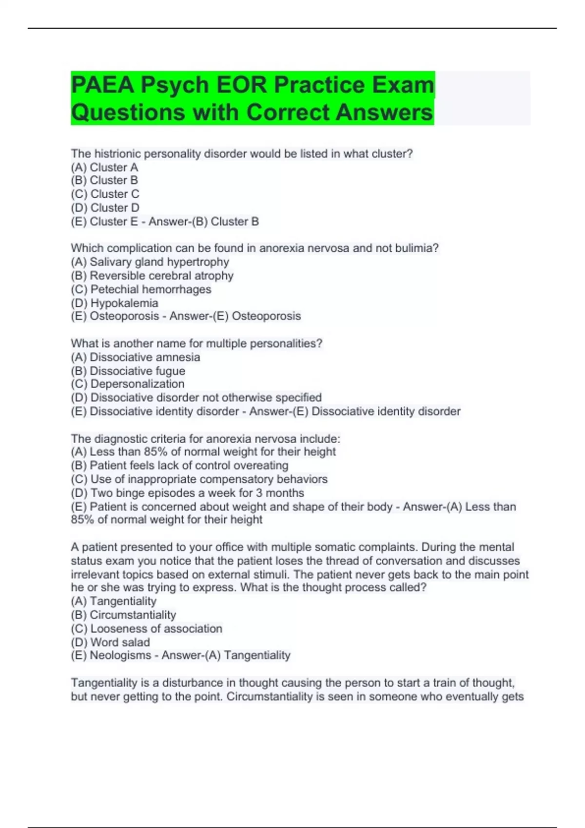PAEA Psych EOR Practice Exam Questions with Correct Answers