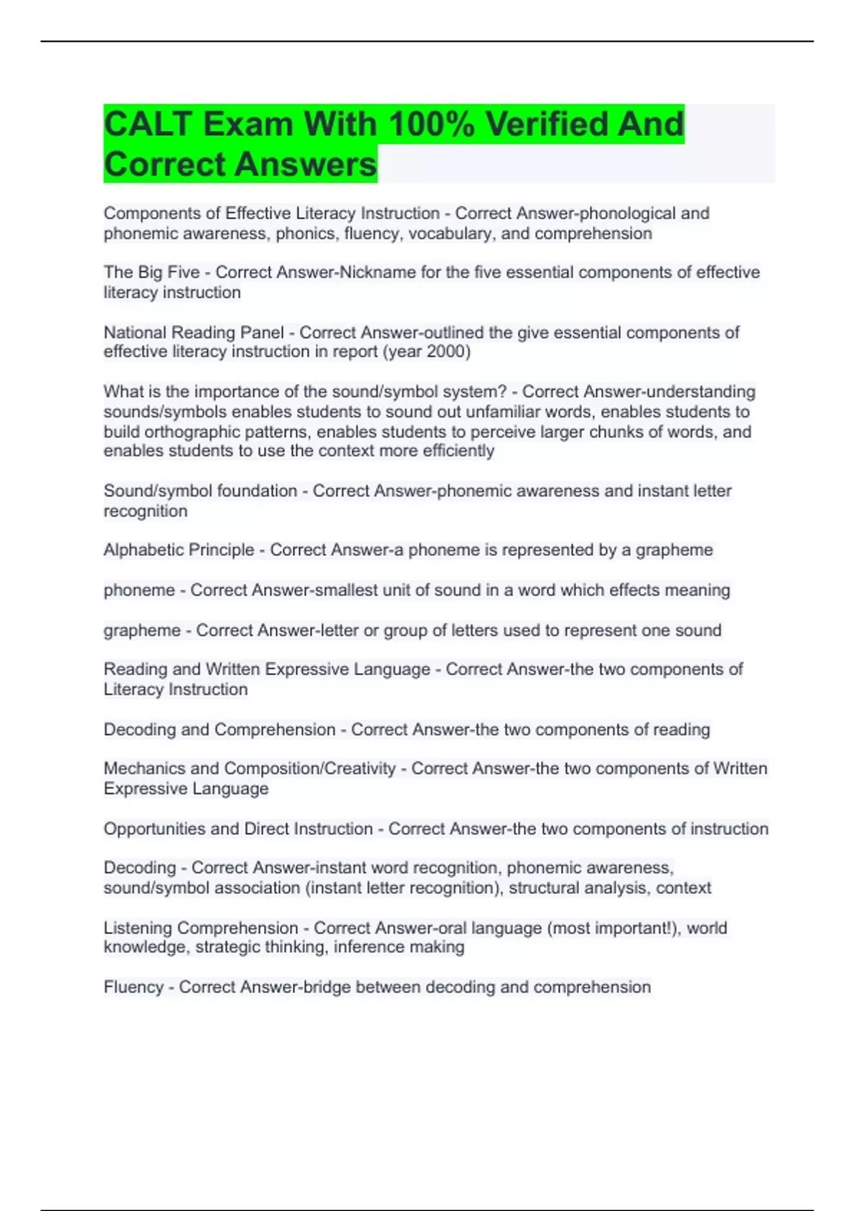 CALT Exam With 100% Verified And Correct Answers