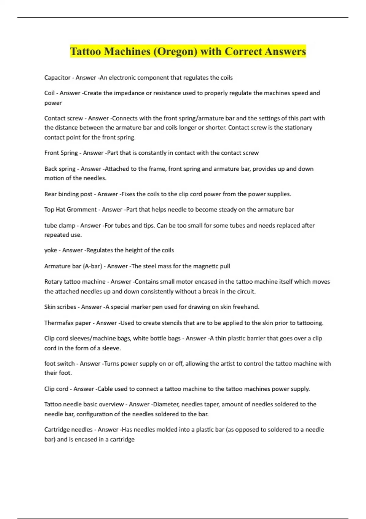 Tattoo Machines (Oregon) with Correct Answers Capacitor - Answer -An electronic component that regulates the coils Coil - Answer -Create the impedance or resistance used to properly regulate the machines speed and power Contact screw - Answer -Connects with the front spring/armature bar and the settings of this part with the distance between the armature bar and coils longer or shorter. Contact screw is the stationary contact point for the front spring. Front Spring - Answer -Part that is constantly in contact with the contact screw Back spring - Answer -Attached to the frame, front spring and armature bar, provides up and down motion of the needles. Rear binding post - Answer -Fixes the coils to the clip cord power from the power supplies. Top Hat Gromment - Answer -Part that helps needle to become steady on the armature bar tube clamp - Answer -For tubes and tips. Can be too small for some tubes and needs replaced after repeated use. yoke - Answer -Regulates the height of the coils Armature bar (A-bar) - Answer -The steel mass for the magnetic pull Rotary tattoo machine - Answer -Contains small motor encased in the tattoo machine itself which moves the attached needles up and down consistently without a break in the circuit. Skin scribes - Answer -A special marker pen used for drawing on skin freehand. Thermafax paper - Answer -Used to create stencils that are to be applied to the skin prior to tattooing. Clip cord sleeves/machine bags, white bottle bags - Answer -A thin plastic barrier that goes over a clip cord in the form of a sleeve. foot switch - Answer -Turns power supply on or off, allowing the artist to control the tattoo machine with their foot. Clip cord - Answer -Cable used to connect a tattoo machine to the tattoo machines power suppl