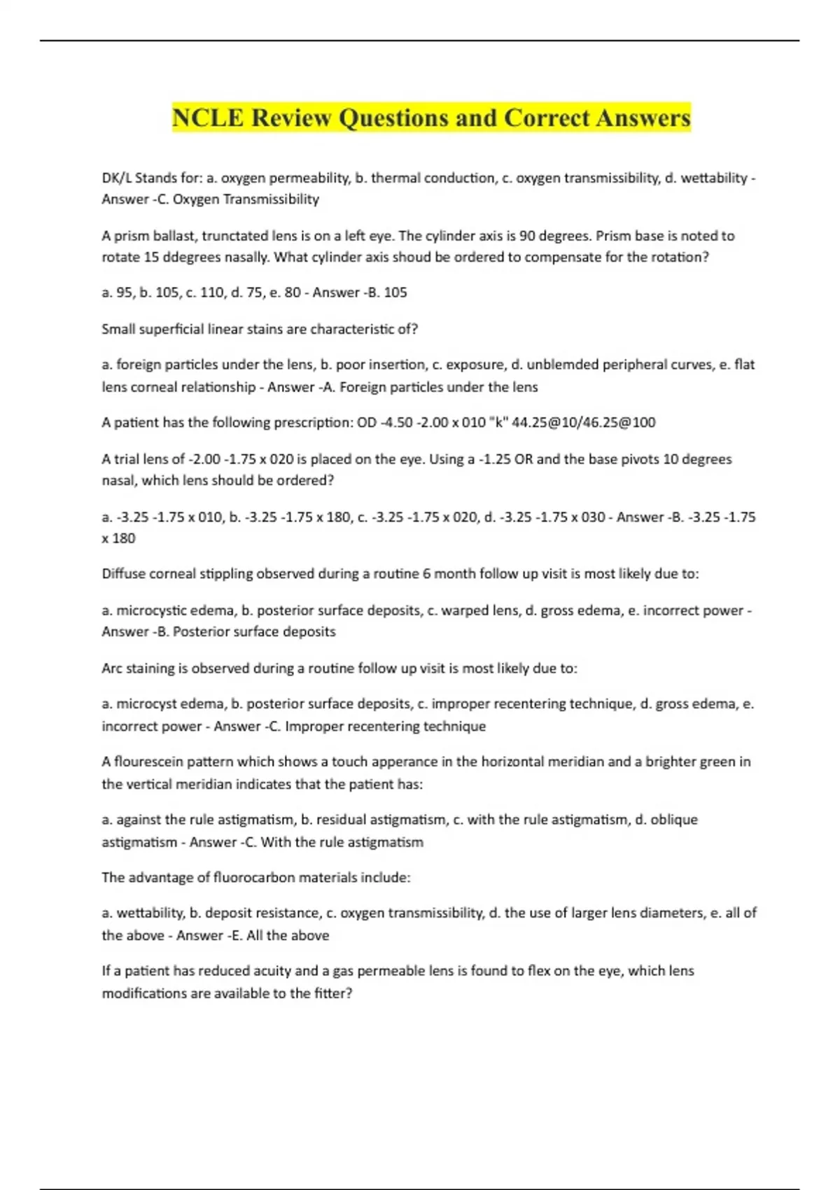 NCLE Review Questions and Correct Answers DK/L Stands for: a. oxygen permeability, b. thermal conduction, c. oxygen transmissibility, d. wettability - Answer -C. Oxygen Transmissibility A prism ballast, trunctated lens is on a left eye. The cylinder axis is 90 degrees. Prism base is noted to rotate 15 ddegrees nasally. What cylinder axis shoud be ordered to compensate for the rotation? a. 95, b. 105, c. 110, d. 75, e. 80 - Answer -B. 105 Small superficial linear stains are characteristic of? a. foreign particles under the lens, b. poor insertion, c. exposure, d. unblemded peripheral curves, e. flat lens corneal relationship - Answer -A. Foreign particles under the lens A patient has the following prescription: OD -4.50 -2.00 x 010 "k" 44.25@10/46.25@100 A trial lens of -2.00 -1.75 x 020 is placed on the eye. Using a -1.25 OR and the base pivots 10 degrees nasal, which lens should be ordered? a. -3.25 -1.75 x 010, b. -3.25 -1.75 x 180, c. -3.25 -1.75 x 020, d. -3.25 -1.75 x 030 - Answer -B. -3.25 -1.75 x 180 Diffuse corneal stippling observed during a routine 6 month follow up visit is most likely due to: a. microcystic edema, b. posterior surface deposits, c. warped lens, d. gross edema, e. incorrect power - Answer -B. Posterior surface deposits Arc staining is observed during a routine follow up visit is most likely due to: a. microcyst edema, b. posterior surface deposits, c. improper recentering technique, d. gross edema, e. incorrect power - Answer -C. Improper recentering technique A flourescein pattern which shows a touch apperance in the horizontal meridian and a brighter green in the vertical meridian indicates that the patient has: a. against the rule astigmatism, b. residual astigmatism, c. w