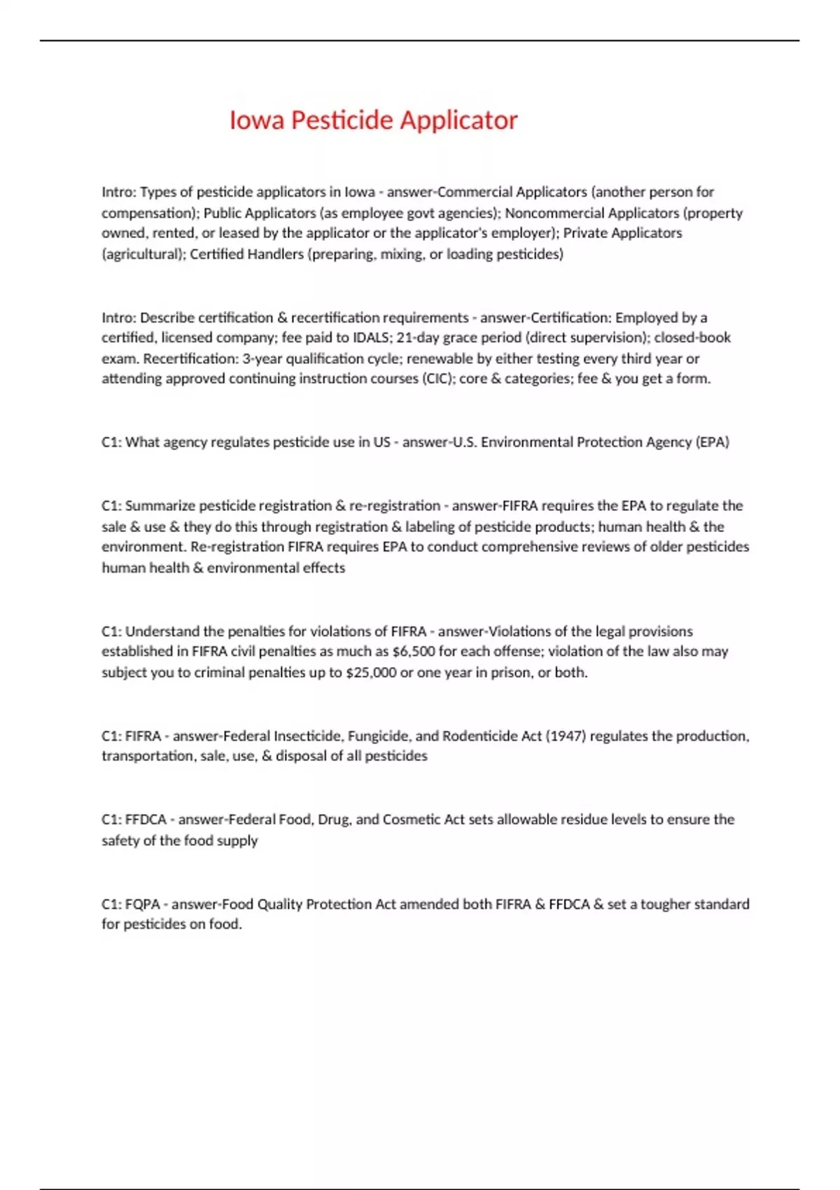 Intro: Types of pesticide applicators in Iowa - answer-Commercial Applicators (another person for compensation); Public Applicators (as employee govt agencies); Noncommercial Applicators (property owned, rented, or leased by the applicator or the applicator's employer); Private Applicators (agricultural); Certified Handlers (preparing, mixing, or loading pesticides) Intro: Describe certification & recertification requirements - answer-Certification: Employed by a certified, licensed company; fee paid to IDALS; 21-day grace period (direct supervision); closed-book exam. Recertification: 3-year qualification cycle; renewable by either testing every third year or attending approved continuing instruction courses (CIC); core & categories; fee & you get a form. C1: What agency regulates pesticide use in US - answer-U.S. Environmental Protection Agency (EPA) C1: Summarize pesticide registration & re-registration - answer-FIFRA requires the EPA to regulate the sale & use & they do this through registration & labeling of pesticide products; human health & the environment. Re-registration FIFRA requires EPA to conduct comprehensive reviews of older pesticides human health & environmental effects C1: Understand the penalties for violations of FIFRA - answer-Violations of the legal provisions established in FIFRA civil penalties as much as $6,500 for each offense; violation of the law also may subject you to criminal penalties up to $25,000 or one year in prison, or both. C1: FIFRA - answer-Federal Insecticide, Fungicide, and Rodenticide Act (1947) regulates the production, transportation, sale, use, & disposal of all pesticides C1: FFDCA - answer-Federal Food, Drug, and Cosmetic Act sets allowable residue levels to ensure the safety of the food supply C1: FQPA - answer-Food Quality Protection Act amended both FIFRA & FFDCA & set a tougher standard for pesticides on food. C1: Residues & Tolerances - answer-Residues: Small amounts of pesticides on fruits, vegetables, grains, other foods, & animal feeds. Tolerances: the EPA sets allowable residue levels under FFDCA regs, safe tolerances "a reasonable certainty of no harm". C1: How does the ESA relate to pesticides - answer-The Endangered Species Act (ESA): Pesticides use may directly or indirectly, through drift and runoff, affect endangered or threatened species & their habitat. C1: Summarize RCRA - answer-Resource Conservation and Recovery Act (RCRA) gives EPA the authority to control hazardous waste from the "cradle-to-grave", rinsates & hazardous waste; become solid wastes when you want to discard.