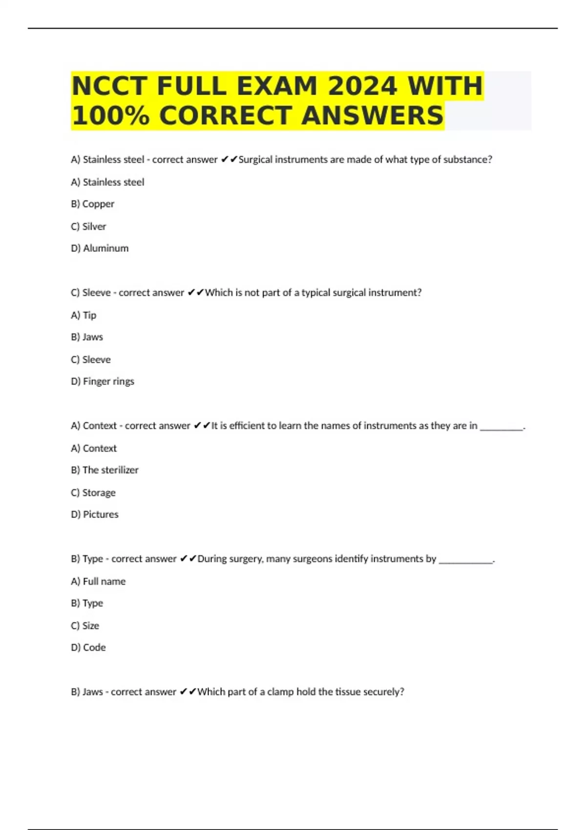 A) Stainless steel - correct answer Surgical instruments are made of what type of substance? A) Stainless steel B) Copper C) Silver D) Aluminum C) Sleeve - correct answer Which is not part of a typical surgical instrument? A) Tip B) Jaws C) Sleeve D) Finger rings A) Context - correct answer It is efficient to learn the names of instruments as they are in ________. A) Context B) The sterilizer C) Storage D) Pictures B) Type - correct answer During surgery, many surgeons identify instruments by __________. A) Full name B) Type C) Size D) Code B) Jaws - correct answer Which part of a clamp hold the tissue securely? A) Shank B) Jaws C) Hinge D) Blade C) Hemostats - correct answer The most common types of clamps are called _______. A) Scalpel B) Forceps C) Hemostats D) Holders A) Holding tissue to the side away from the wound - correct answer Retractors are used for _________. A) Holding tissue to the side away from the wound B) Closing vessels C) Incision D) Sutures A) Scalpel handle B) Scalpel blade C) Scissors D) Thumb forceps E) Retractor F) Hemostatic clamp - correct answer (Figure 1) Name each of the above instruments with it's generic name, proceeding from left to right. A) B) C) D) E) F) A) Needle holder B) Suction tip C) Obstetric forceps D) Cardiovascular scissors E) Bone cutter - correct answer (Figure 2) Examine the photograph above and identify the instruments from left to right. A) B) C) D) E) E) Heavy needle drivers - correct answer Heavy suturing: A) Fine needle drivers B) Towel holders C) Hemostats D) Wire cutters E) Heavy needle drivers C) Hemostats