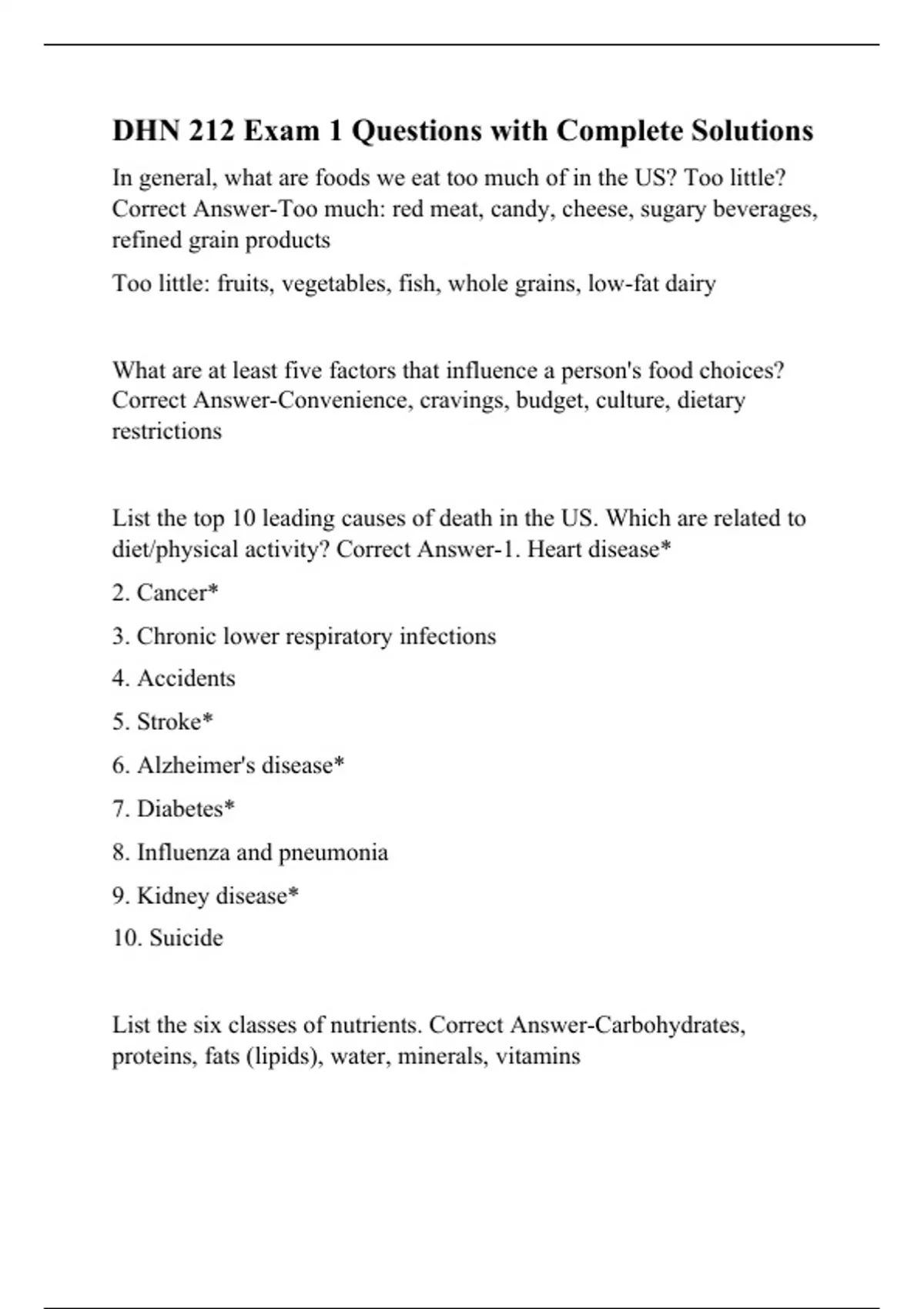 In general, what are foods we eat too much of in the US? Too little? Correct Answer-Too much: red meat, candy, cheese, sugary beverages, refined grain products Too little: fruits, vegetables, fish, whole grains, low-fat dairy What are at least five factors that influence a person's food choices? Correct Answer-Convenience, cravings, budget, culture, dietary restrictions List the top 10 leading causes of death in the US. Which are related to diet/physical activity? Correct Answer-1. Heart disease* 2. Cancer* 3. Chronic lower respiratory infections 4. Accidents 5. Stroke* 6. Alzheimer's disease* 7. Diabetes* 8. Influenza and pneumonia 9. Kidney disease* 10. Suicide List the six classes of nutrients. Correct Answer-Carbohydrates, proteins, fats (lipids), water, minera
