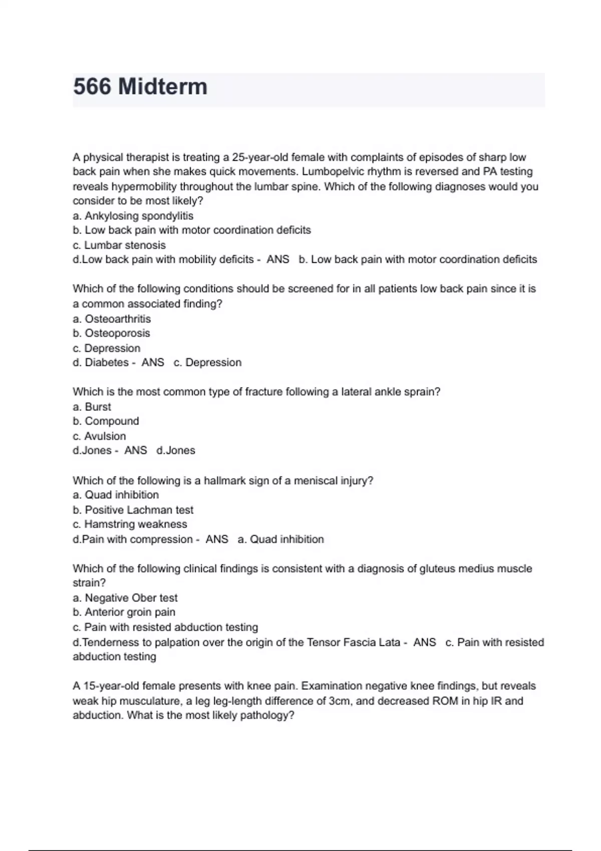 MN 566 Midterm Exam Questions And Answers A physical therapist is treating a 25-year-old female with complaints of episodes of sharp low back pain when she makes quick movements. Lumbopelvic rhythm is reversed and PA testing reveals hypermobility throughout the lumbar spine. Which of the following diagnoses would you consider to be most likely? a. Ankylosing spondylitis b. Low back pain with motor coordination deficits c. Lumbar stenosis d.Low back pain with mobility deficits - ANS b. Low back pain with motor coordination deficits Which of the following conditions should be screened for in all patients low back pain since it is a common associated finding? a. Osteoarthritis b. Osteoporosis c. Depression d. Diabetes - ANS c. Depression Which is the most common type of fracture following a lateral ankle sprain? a. Burst b. Compound c. Avulsion d.Jones - ANS d.Jones Which of the following is a hallmark sign of a meniscal injury? a. Quad inhibition b. Positive Lachman test c. Hamstring weakness d.Pain with compression - ANS a. Quad inhibition Which of the following clinical findings is consistent with a diagnosis of gluteus medius muscle strain? a. Negative Ober test b. Anterior groin pain c. Pain with resisted abduction testing d.Tenderness to palpation over the origin of the Tensor Fascia Lata - ANS c. Pain with resisted abduction testing A 15-year-old female presents with knee pain. Examination negative knee findings, but reveals weak hip musculature, a leg leg-length difference of 3cm, and decreased ROM in hip IR and abduction. What is the most likely pathology? a. Legg Calve Perthes b. Posterior hip dislocation c. Mid-shaft femur fracture d. Slipped capped femoral epiphysis - ANS d. Slipped capped femoral epiphysis Which type of femoral neck stress fracture would require ORIF? a. Tension side b. Compression side c. Lateral side d. Inferior side - ANS a. Tension side Progressive onset of pain, numbness, weakness, and tingling in the low back and buttocks of an older adult that is increased by standing and walking and eased by sitting, is a hallmark of which condition: a. Facet joint dysfunction b. Lateral stenosis c. Non-specific low back pain d. Spinal stenosis - ANS d. Spinal stenosis A physical therapist is treating a 25-year-old female with complaints of episodes of sharp low back pain when she makes quick movements. Lumbopelvic rhythm is reversed and PA testing reveals hypermobility throughout the lumbar spine. Which of the following diagnoses would you consider to be most likely? a. Ankylosing spondylitis b. Low back pain with motor coordination deficits c. Lumbar stenosis d.Low back pain with mobility deficits - ANS b. Low back pain with motor coordination deficits Which of the following conditions should be screened for in all patients low back pain since it is a common associated finding? a. Osteoarthritis b. Osteoporosis c. Depression d. Diabetes - ANS c. Depression Which is the most common type of fracture following a lateral ankle sprain? a. Burst b. Compound c. Avulsion d.Jones - ANS d.Jones Which of the following is a hallmark sign of a meniscal injury? a. Quad inhibition b. Positive Lachman test c. Hamstring weakness d.Pain with compression - ANS a. Quad inhibition Which of the following clinical findings is consistent with a diagnosis of gluteus medius muscle strain? a. Negative Ober test b. Anterior groin pain c. Pain with resisted abduction testing d.Tenderness to palpation over the origin of the Tensor Fascia Lata - ANS c. Pain with resisted abduction testing A 15-year-old female presents with knee pain. Examination negative knee findings, but reveals weak hip musculature, a leg leg-length difference of 3cm, and decreased ROM in hip IR and abduction. What is the most likely pathology? a. Legg Calve Perthes b. Posterior hip dislocation c. Mid-shaft femur fracture d. Slipped capped femoral epiphysis - ANS d. Slipped capped femoral epiphysis Which type of femoral neck stress fracture would require ORIF? a. Tension side b. Compression side c. Lateral side d. Inferior side - ANS a. Tension side Progressive onset of pain, numbness, weakness, and tingling in the low back and buttocks of an older adult that is increased by standing and walking and eased by sitting, is a hallmark of which condition: a. Facet joint dysfunction b. Lateral stenosis c. Non-specific low back pain d. Spinal stenosis - ANS d. Spinal stenosis