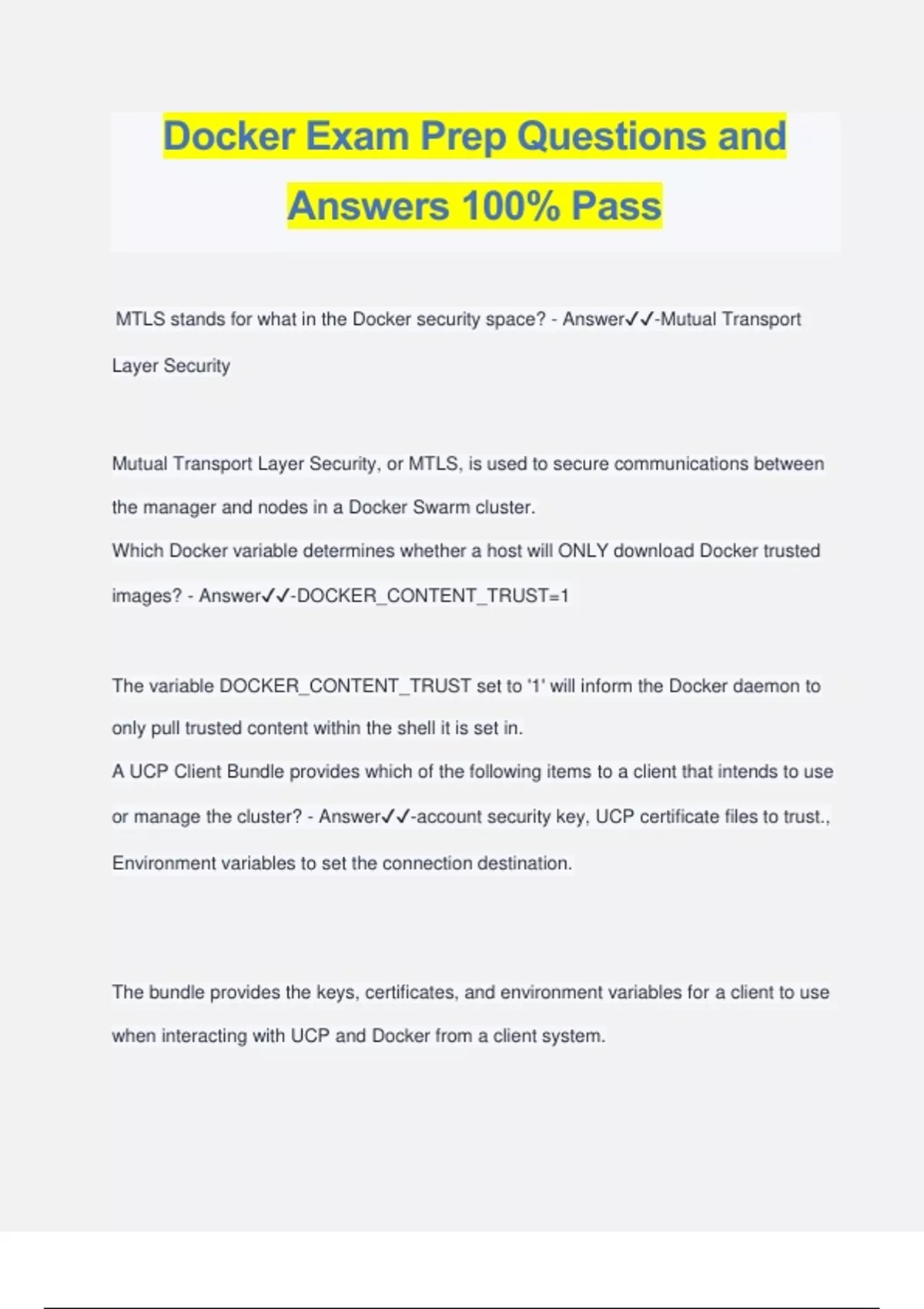 Docker Exam Prep Questions and Answers 100% Pass MTLS stands for what in the Docker security space? - Answer️️ -Mutual Transport Layer Security Mutual Transport Layer Security, or MTLS, is used to secure communications between the manager and nodes in a Docker Swarm cluster. Which Docker variable determines whether a host will ONLY download Docker trusted images? - Answer️️ -DOCKER_CONTENT_TRUST=1 The variable DOCKER_CONTENT_TRUST set to '1' will inform the Docker daemon to only pull trusted content within the shell it is set in. A UCP Client Bundle provides which of the following items to a client that intends to use or manage the cluster? - Answer️️ -account security key, UCP certificate files to trust., Environment variables to set the connection destination. The bundle provides the keys, certificates, and environment variables for a client to use when interacting with UCP and Docker from a client system. What do you use to gracefully remove a node from a swarm cluster? - Answer️️ - Docker swarm leave ( on the node you want to remove) What is the command used to initialize 'swarm mode'? - Answer️️ -docker swarm init How do you push the new image called 'httpd:new' to the default repo? - Answer️️ - Docker push httpd:new (prompt for username/password). What is the command to initialize a single replica? - Answer️️ -docker service create [image] How do you create a Docker image from a Dockerfile in the current directory, naming the image 'myimage:v1' - Answer️️ -docker build -t myimage:v1 . What is the 'docker swarm unlock-key --rotate' command for? - Answer️️ -It performs a key rotation for security on a regular basis. What is the command to remove a service from your swarm cluster? - Answer️️ - docker service rm [SERVICE NAME] 'docker volume ls' - Answer️️ -- Lists created volumes. - Will propagate on service creation. The directive in a Dockerfile that instantiated containers will listen on the indicated port at launch - Answer️️ -EXPOSE 'docker network create' - Answer️️ -- --driver=overlay - --subnet=[network/mask] - --gateway=[IP] - --ip-range=[subnet/mask] - only good to further divide ne