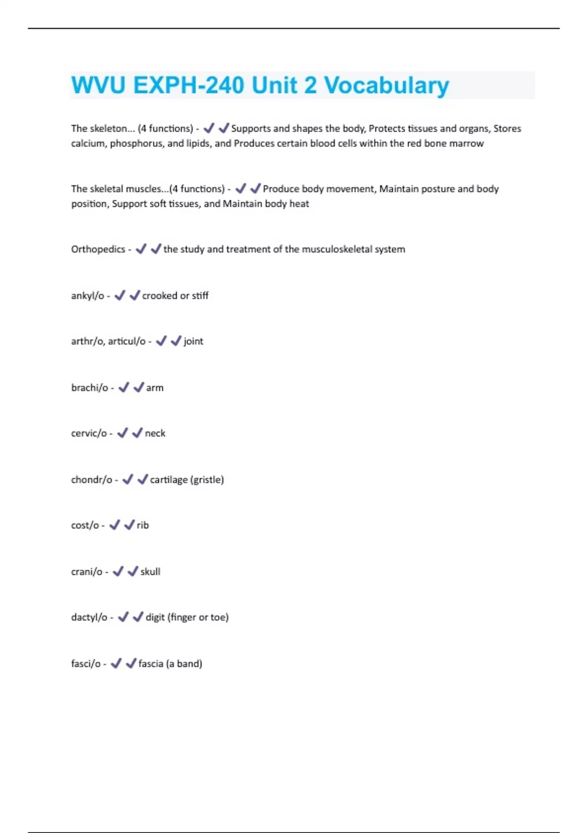 The skeleton... (4 functions) - Supports and shapes the body, Protects tissues and organs, Stores calcium, phosphorus, and lipids, and Produces certain blood cells within the red bone marrow The skeletal muscles...(4 functions) - Produce body movement, Maintain posture and body position, Support soft tissues, and Maintain body heat Orthopedics - the study and treatment of the musculoskeletal system ankyl/o - crooked or stiff arthr/o, articul/o - joint brachi/o - arm cervic/o - neck chondr/o - cartilage (gristle) cost/o - rib crani/o - skull dactyl/o - digit (finger or toe) fasci/o - fascia (a band)femor/o - femur fibr/o - fiber kyph/o - humped-back lei/o - smooth lord/o - bent lumb/o - loin (lower back) muscul/o, my/o, myos/o - muscle myel/o - bone marrow or spinal cord oste/o - bone patell/o - knee cap pelv/i - pelvis (basin) or hip bone radi/o - radius rhabd/o - rod-shaped or striated (skeletal) sarc/o - fleshscoli/o - twisted spondyl/o, vertebr/o - vertebra stern/o - sternum (breastbone) ten/o, tend/o, tendin/o - tendon (to stretch) thorac/o - chest ton/o - tone or tension uln/o - ulna appendicular skeleton - bones of the shoulder girdle, pelvis, and limbs (arms and legs) axial skeleton - bones of the skull, vertebral column, chest (thorax), and hyoid bone (U-shaped bone at the base of the tongue) bone - specialized connective tissue composed of osteocytes (bone cells); forms the skeleton compact bone - tightly solid bone tissue that forms the exterior of bones spongy bone (cancellous bone) - mesh-like bone tissue found in the interior of bones, and surrounding the medullary cavity long bones - elongated bones of the arms and legs short bones - square-shaped bones of the wrists and anklesflat bones - thin, flattened bones of the ribs, shoulder blades (scapulae), pelvis, and skull irregular bones - bones of the vertebrae and face sesamoid bones - round bones found near joints (e.g., the patella) epiphysis - wide ends of a long bone (physis = growth) diaphysis - shaft of a long bone metaphysis - growth zone between the epiphysis and the diaphysis during development of a long bone endosteum - membrane lining the medullary cavity of a bone medullary cavity - cavity within the shaft of the long bones; filled with bone marrow bone marrow - soft connective tissue within the medullary cavity of bones red bone marrow - functions to form red blood cells, some white blood cells, and platelets; found in the cavities of most bones in infants and in the flat bones in adults yellow bone marrow - gradually replaces red bone marrow in adult bones; functions as storage for lipids (fat tissue) and is inactive in the formation of blood cells periosteum - a fibrous, vascular membrane that covers the bone