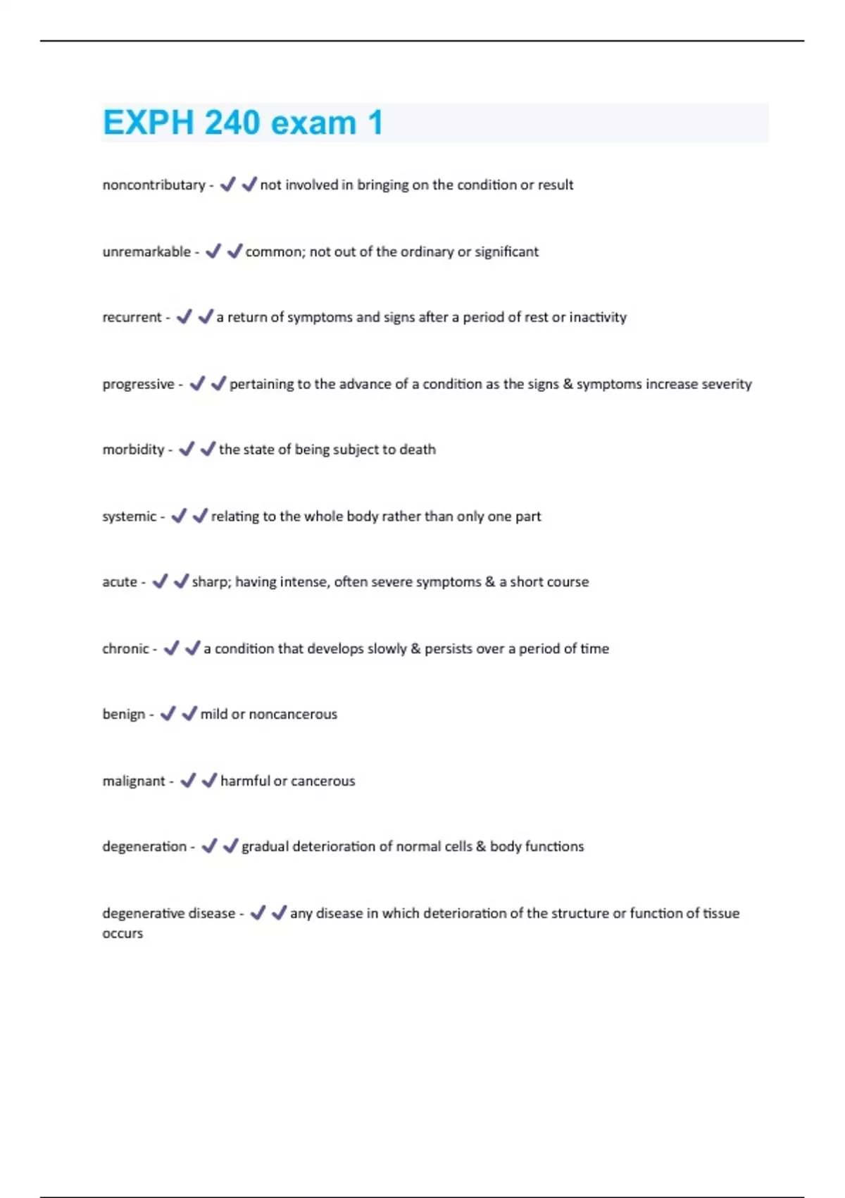 noncontributary - not involved in bringing on the condition or result unremarkable - common; not out of the ordinary or significant recurrent - a return of symptoms and signs after a period of rest or inactivity progressive - pertaining to the advance of a condition as the signs & symptoms increase severity morbidity - the state of being subject to death systemic - relating to the whole body rather than only one part acute - sharp; having intense, often severe symptoms & a short course chronic - a condition that develops slowly & persists over a period of time benign - mild or noncancerous malignant - harmful or cancerous degeneration - gradual deterioration of normal cells & body functions degenerative disease - any disease in which deterioration of the structure or function of tissue occursdiagnosis - determination of the presence of a disease based on an evaluation of symptoms, signs, & test findings/ results remission - a period in which symptoms & signs stop or abate localized - limited to a definite area or part exacerbation - increase in the severity of a disease, w/ aggravation of symptoms malaise - a feeling of uneasiness or discomfort; often the first indication of illness prophylaxis - a process or measure that prevents disease febrile - relating to a fever etiology - study of the cause of a disease