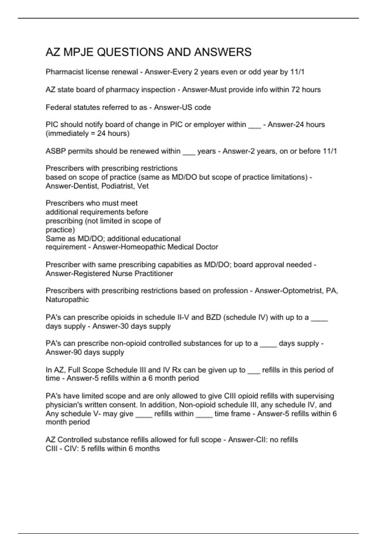 Pharmacist license renewal - Answer-Every 2 years even or odd year by 11/1 AZ state board of pharmacy inspection - Answer-Must provide info within 72 hours Federal statutes referred to as - Answer-US code PIC should notify board of change in PIC or employer within ___ - Answer-24 hours (immediately = 24 hours) ASBP permits should be renewed within ___ years - Answer-2 years, on or before 11/1 Prescribers with prescribing restrictions based on scope of practice (same as MD/DO but scope of practice limitations) - Answer-Dentist, Podiatrist, Vet Prescribers who must meet additional requirements before prescribing (not limited in scope of practice) Same as MD/DO; additional educational requirement - Answer-Homeopathic Medical Doctor Prescriber with same prescribing capabities as MD/DO; board approval needed - Answer-Registered Nurse Practitioner Prescribers with prescribing restrictions based on profession - Answer-Optometrist, PA, Naturopathic PA's can prescribe opioids in schedule II-V and BZD (schedule IV) with up to a ____ days supply - Answer-30 days supply PA's can prescribe non-opioid controlled substances for up to a ____ days supply - Answer-90 days supply In AZ, Full Scope Schedule III and IV Rx can be given up to ___ refills in this period of time - Answer-5 refills within a 6 month period PA's have limited scope and are only allowed to give CIII opioid refills with supervising physician's written consent. In addition, Non-opioid schedule III, any schedule IV, and Any schedule V- may give ____ refills within ____ time frame - Answer-5 refills within 6 month period AZ Controlled substance refills allowed for full scope - Answer-CII: no refills C