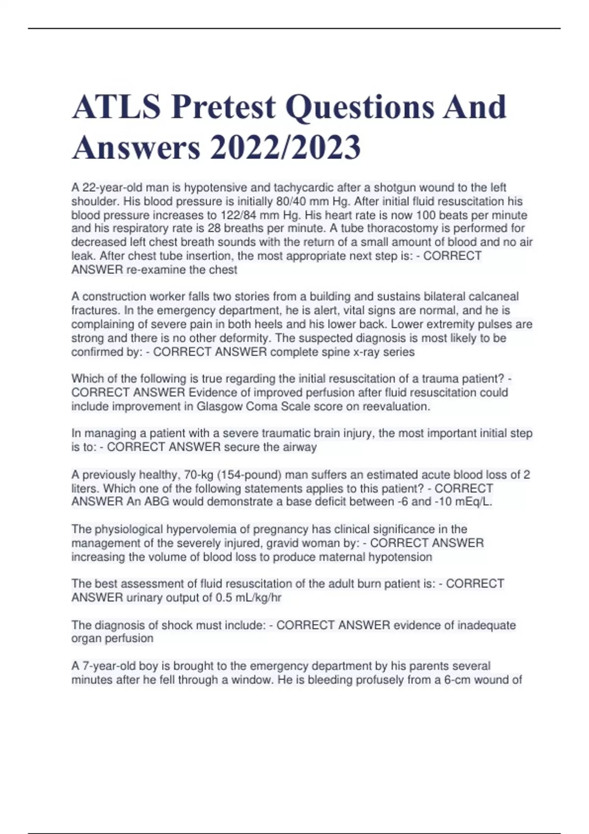A 22-year-old man is hypotensive and tachycardic after a shotgun wound to the left shoulder. His blood pressure is initially 80/40 mm Hg. After initial fluid resuscitation his blood pressure increases to 122/84 mm Hg. His heart rate is now 100 beats per minute and his respiratory rate is 28 breaths per minute. A tube thoracostomy is performed for decreased left chest breath sounds with the return of a small amount of blood and no air leak. After chest tube insertion, the most appropriate next step is: - CORRECT ANSWER re-examine the chest A construction worker falls two stories from a building and sustains bilateral calcaneal fractures. In the emergency department, he is alert, vital signs are normal, and he is complaining of severe pain in both heels and his lower back. Lower extremity pulses are strong and there is no other deformity. The suspected diagnosis is most likely to be confirmed by: - CORRECT ANSWER complete spine x-ray series Which of the following is true regarding the initial resuscitation of a trauma patient? - CORRECT ANSWER Evidence of improved perfusion after fluid resuscitation could include improvement in Glasgow Coma Scale score on reevaluation. In managing a patient with a severe traumatic brain injury, the most important initial step is to: - CORRECT ANSWER secure the airway A previously healthy, 70-kg (154-pound) man suffers an estimated acute blood loss of 2 liters. Which one of the following statements applies to this patient? - CORRECT ANSWER An ABG would demonstrate a base deficit between -6 and -10 mEq/L. The physiological hypervolemia of pregnancy has clinical significance in the management of the severely injured, gravid woman by: - CORRECT ANSWER increasing the volume of blood loss to produce maternal hypotension The best assessment of fluid resuscitation of the adult burn patient is: - CORRECT ANSWER urinary output of 0.5 mL/kg/hr The diagnosis of shock must include: - CORRECT ANSWER evidence of inadequate organ perfusion A 7-year-old boy is brought to the emergency department by his parents several minutes after he fell through a window. He is bleeding profusely from a 6-cm wound of