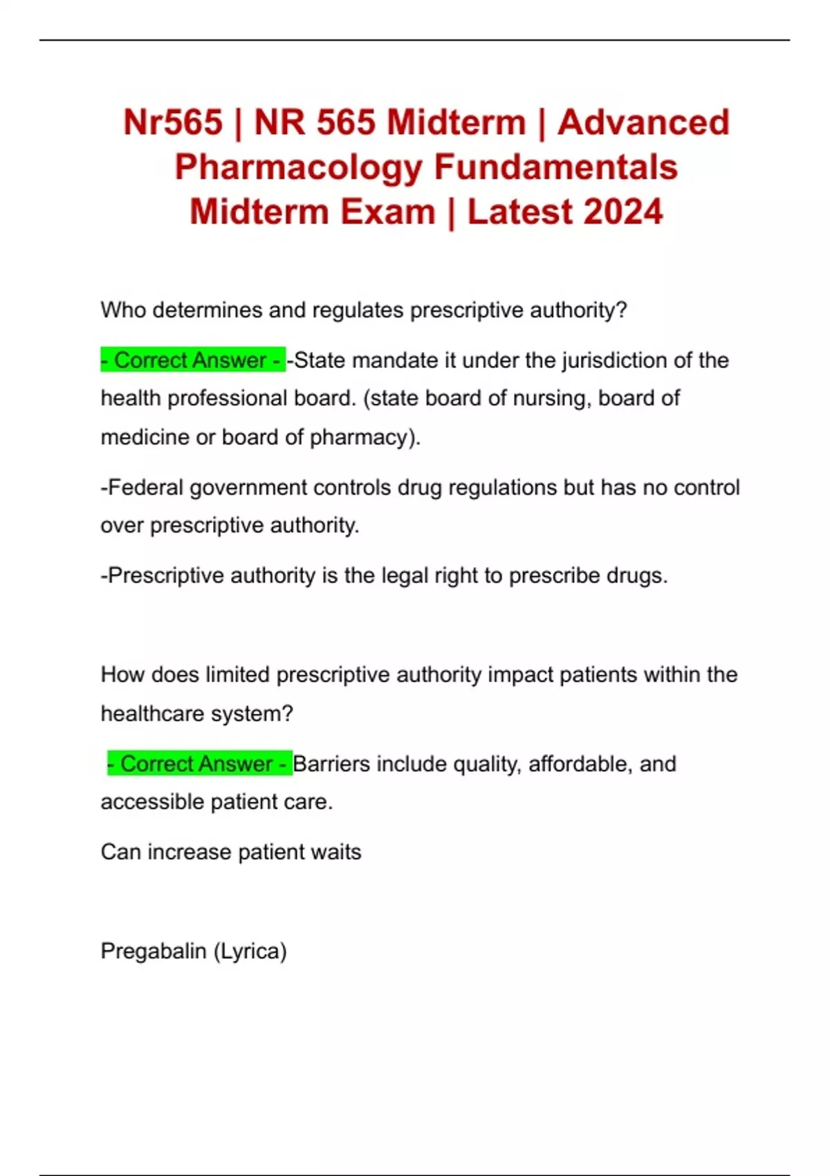 Nr565 | NR 565 Midterm | Advanced Pharmacology Fundamentals Midterm Exam | Latest 2024 Nr565 | NR 565 Midterm | Advanced Pharmacology Fundamentals Midterm Exam | Latest 2024
