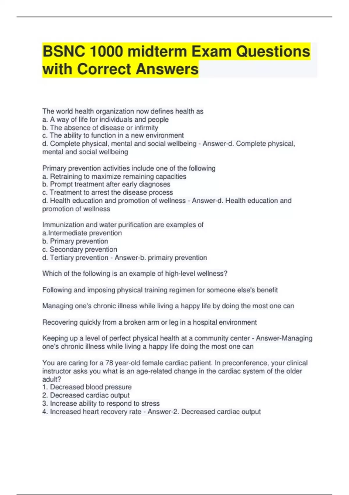 BSNC 1000 midterm Exam Questions with Correct Answers The world health organization now defines health as a. A way of life for individuals and people b. The absence of disease or infirmity c. The ability to function in a new environment d. Complete physical, mental and social wellbeing - Answer-d. Complete physical, mental and social wellbeing Primary prevention activities include one of the following a. Retraining to maximize remaining capacities b. Prompt treatment after early diagnoses c. Treatment to arrest the disease process d. Health education and promotion of wellness - Answer-d. Health education and promotion of wellness Immunization and water purification are examples of a.Intermediate prevention b. Primary prevention c. Secondary prevention d. Tertiary prevention - Answer-b. primairy prevention Which of the following is an example of high-level wellness? Following and imposing physical training regimen for someone else's benefit Managing one's chronic illness while living a happy life by doing the most one can Recovering quickly from a broken arm or leg in a hospital environment Keeping up a level of perfect physical health at a community center - Answer-Managing one's chronic illness while living a happy life doing the most one can You are caring for a 78 year-old female cardiac patient. In preconference, your clinical instructor asks you what is an age-related change in the cardiac system of the older adult? 1. Decreased blood pressure 2. Decreased cardiac output 3. Increase ability to respond to stress 4. Increased heart recovery rate - Answer-2. Decreased cardiac output The nurse is setting up an education session with an 85-year-old patient who will be going home on anticoagulant therapy. Which strategy would reflect consideration of aging changes that may exist with this patient? A. show a colorful video about anticoagulation therapy. B. Present all the information in one session just before discharge. C. Give the patient pamphlets about the medications to read at home. D. Develop large-print handouts that reflect the verbal information presented. - Answer- D. Develop large-print handouts that reflect the verbal information presented. A 70-year-old client asks the nurse to explain to her about hypertension. An appropriate response by the nurse as to why older clients often have hypertension is due to: A. Myocardial muscle damage B. Reduction in physical activity C. Ingestion of foods high in sodium D. Accumulation of plaque on arterial walls - Answer-D. Accumulation of plaque on arterial walls When caring for an older adult patient, the nurse uses the following interventions to accommodate visual changes with age: A. Eye glasses in the bedside table. B. Adequate lighting and uncluttered walkways. C. Draw drapes in room to prevent glare. D. Keep bedside rails down. - Answer-B. Adequate lighting and uncluttered walkways. Which nurse will best understand the mission of population health nursing? The nurse who: a. Understands the needs of the individuals and families that comprise the populations with which they work b. Focuses on the population rather than on individuals. c. Is diligent about keeping abreast of new treatments and technologies. d.Applies a single population-based strategy to achieve health and wellness - Answer-Understands the needs of the individuals and families that comprise the populations with which they work. Correct: The definition of population health is evolving, but at present it can be defined as the attainment of the greatest possible biologic, psychological, and social well-being of the total population as an entity and of its individual members. The nurse is gathering community assessment data about concerns of the elderly. Which term best describes the group of elders in this situation? a. Community b. Neighborhood c. Population d. Aggregate - Answer-Aggregate Correct: Aggregates are subpopulations that possess some common characteristics, which are often related to high risk for specific health problems. A community health nurse assists clients with planning a wellness clinic that will include screening and immunizations. This is an example of which level of prevention? a. Primary and tertiary b. Secondary c. Primary d. Some primary as well as secondary - Answer-Some primary as well as secondary Correct: Secondary prevention activities include screening and early diagnosis, as well as treatment for existing health problems. Primary prevention can include increasing people's resistance to illness (as in the case of immunization); decreasing or eliminating the causes of health problems; or creating an environment conducive to health rather than health problems.