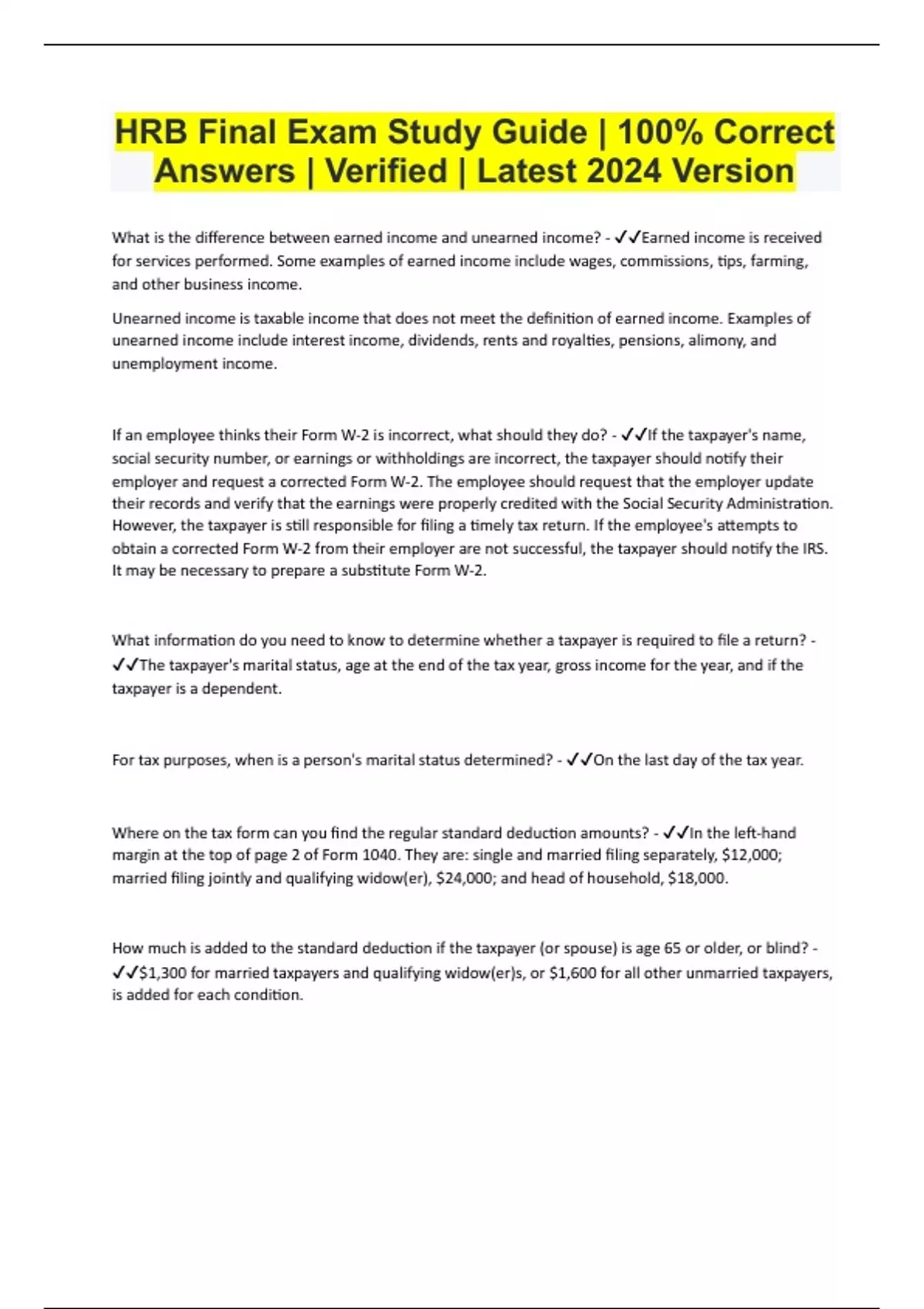 HRB Final Exam Study Guide | 100% Correct Answers | Verified | Latest 2024 Version