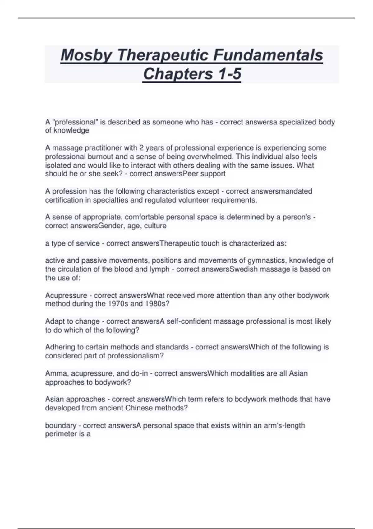 Mosby Therapeutic Fundamentals Chapters 1-5 A "professional" is described as someone who has - correct answersa specialized body of knowledge A massage practitioner with 2 years of professional experience is experiencing some professional burnout and a sense of being overwhelmed. This individual also feels isolated and would like to interact with others dealing with the same issues. What should he or she seek? - correct answersPeer support A profession has the following characteristics except - correct answersmandated certification in specialties and regulated volunteer requirements. A sense of appropriate, comfortable personal space is determined by a person's - correct answersGender, age, culture a type of service - correct answersTherapeutic touch is characterized as: active and passive movements, positions and movements of gymnastics, knowledge of the circulation of the blood and lymph - correct answersSwedish massage is based on the use of: Acupressure - correct answersWhat received more attention than any other bodywork method during the 1970s and 1980s? Adapt to change - correct answersA self-confident massage professional is most likely to do which of the following? Adhering to certain methods and standards - correct answersWhich of the following is considered part of professionalism? Amma, acupressure, and do-in - correct answersWhich modalities are all Asian approaches to bodywork? Asian approaches - correct answersWhich term refers to bodywork methods that have developed from ancient Chinese meth