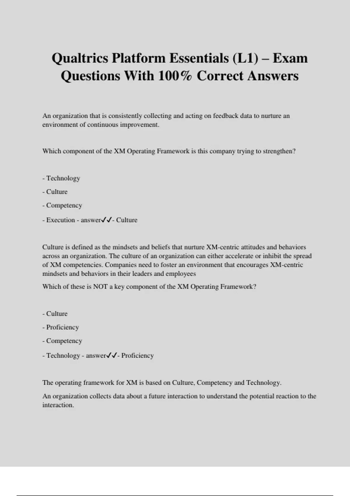 Qualtrics Platform Essentials (L1) – Exam Questions With 100% Correct Answers An organization that is consistently collecting and acting on feedback data to nurture an environment of continuous improvement. Which component of the XM Operating Framework is this company trying to strengthen? - Technology - Culture - Competency - Execution - answer- Culture Culture is defined as the mindsets and beliefs that nurture XM-centric attitudes and behaviors across an organization. The culture of an organization can either accelerate or inhibit the spread of XM competencies. Companies need to foster an environment that encourages XM-centric mindsets and behaviors in their leaders and employees Which of these is NOT a key component of the XM Operating Framework? - Culture - Proficiency - Competency - Technology - answer- Proficiency The operating framework for XM is based on Culture, Competency and Technology. An organization collects data about a future interaction to understand the potential reaction to the interaction. What kind of data is being collected? - Experience Expectations - Ad Hoc Diagnostics - Relationship Attitudes - Choice Preferences - answer- Experience Expectations Experience Expectations is how people think and feel about a future interaction with an organization, which can be collected on a regular cycle or periodically. _____ is a discipline that is used to deliver improved experiences to different stakeholders across an organization to gain competitive advantage. - Employee Management - Culture Management - Customer Management - Experience Management (XM) - answer- Experience Management (XM) As a discipline, XM helps organizations deliver differentiated experiences by continuously listening to feedback, propagating insights, and rapidly adapting to change. Which of the following is an example of Experience data (X data?) - Loyalty Status - Mobile Number - Region - Overall Satisfaction - answer- Overall Satisfaction X data is defined as data that is actively being collected from stakeholders that helps an organization understand experiences. What is an example of a positive insight organizations can gain from Experience Management? - An organization makes a change after it is suggested by customers - An organization becomes aware of a strength that they were not aware of and capitalizes on it - An organization adds new resources that will be beneficial - All of the above - answer- All of the above Positive Insights are usually found when an organization collects experience data and finds ways to improve and continue to grow. A(n) ____ is a moment of truth that affects the human components of your business. - Experience - Gap - Insight - Opportunity - answer- Experience This is how Qualtrics defines an Experience. One example of this would be a customer using a brand new product for the first time. Product satisfaction is an example of O data. True or false? - answer- False O Data is data that is collected as part of the normal course of business that does not measure satisfaction. Data such as phone number, email and region are considered O Data. Which of the following is an example of Operational Data (O-Data)? - Customer ID - Satisfaction Rating - Net Promoter Score (NPS) - Employee Engagement - answer- Customer ID