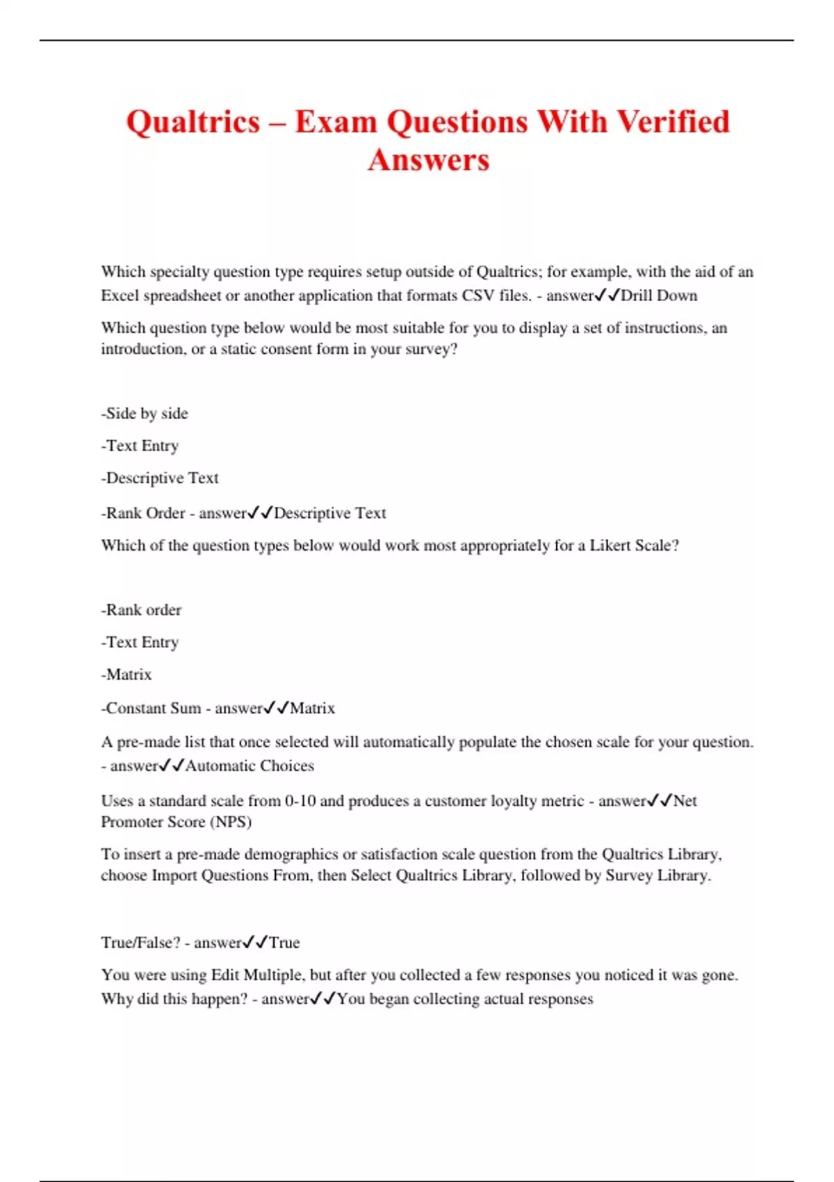 Qualtrics – Exam Questions With Verified Answers Which specialty question type requires setup outside of Qualtrics; for example, with the aid of an Excel spreadsheet or another application that formats CSV files. - answerDrill Down Which question type below would be most suitable for you to display a set of instructions, an introduction, or a static consent form in your survey? -Side by side -Text Entry -Descriptive Text -Rank Order - answerDescriptive Text Which of the question types below would work most appropriately for a Likert Scale? -Rank order -Text Entry -Matrix -Constant Sum - answerMatrix A pre-made list that once selected will automatically populate the chosen scale for your question. - answerAutomatic Choices Uses a standard scale from 0-10 and produces a customer loyalty metric - answerNet Promoter Score (NPS) To insert a pre-made demographics or satisfaction scale question from the Qualtrics Library, choose Import Questions From, then Select Qualtrics Library, followed by Survey Library. True/False? - answerTrue You were using Edit Multiple, but after you collected a few responses you noticed it was gone. Why did this happen? - answerYou began collecting actual responses What is the best way to import questions from one of your own previously created surveys? - answerChoose the Import Questions From option then choose My Surveys. Then choose the survey you need and select the questions you wish to import into the new survey When will it be advisable and/or possible to use Skip Logic? Select all that apply. 1) To set multiple conditions that need to be triggered to move a respondent to a future question or to a later block 2) To skip a respondent to the end of a survey past a large number of questions 3) To send a respondent back to a previous question 4) To skip a respondent to a subsequent question in the same block - answer2 & 4 When will it be advisable and/or possible to use Display Logic? Select all that apply. 1) Use display logic when you have a previous condition that came before the current question 2) Use display logic when you have multiple conditions to consider 3) Use display logic when you're jumping past (or hiding) a lot of unnecessary questions based on the current question - answer1 & 2 Which of the logic types below would be most appropriate to hide questions and/or answer choices from some respondents while showing them to other respondents? -Hide Logic -Branch Logic -Skip Logic -Display Logic - answerDisplay Logic When building your Display Logic with multiple statements, when should you use OR versus AND? Select all that apply. -Use OR when you want any of two statements to be true -Use OR when you want two or more statements to be true -Use AND when you want two or more statements to be true -Use AND for true statements and OR for false statements - answer1 & 3