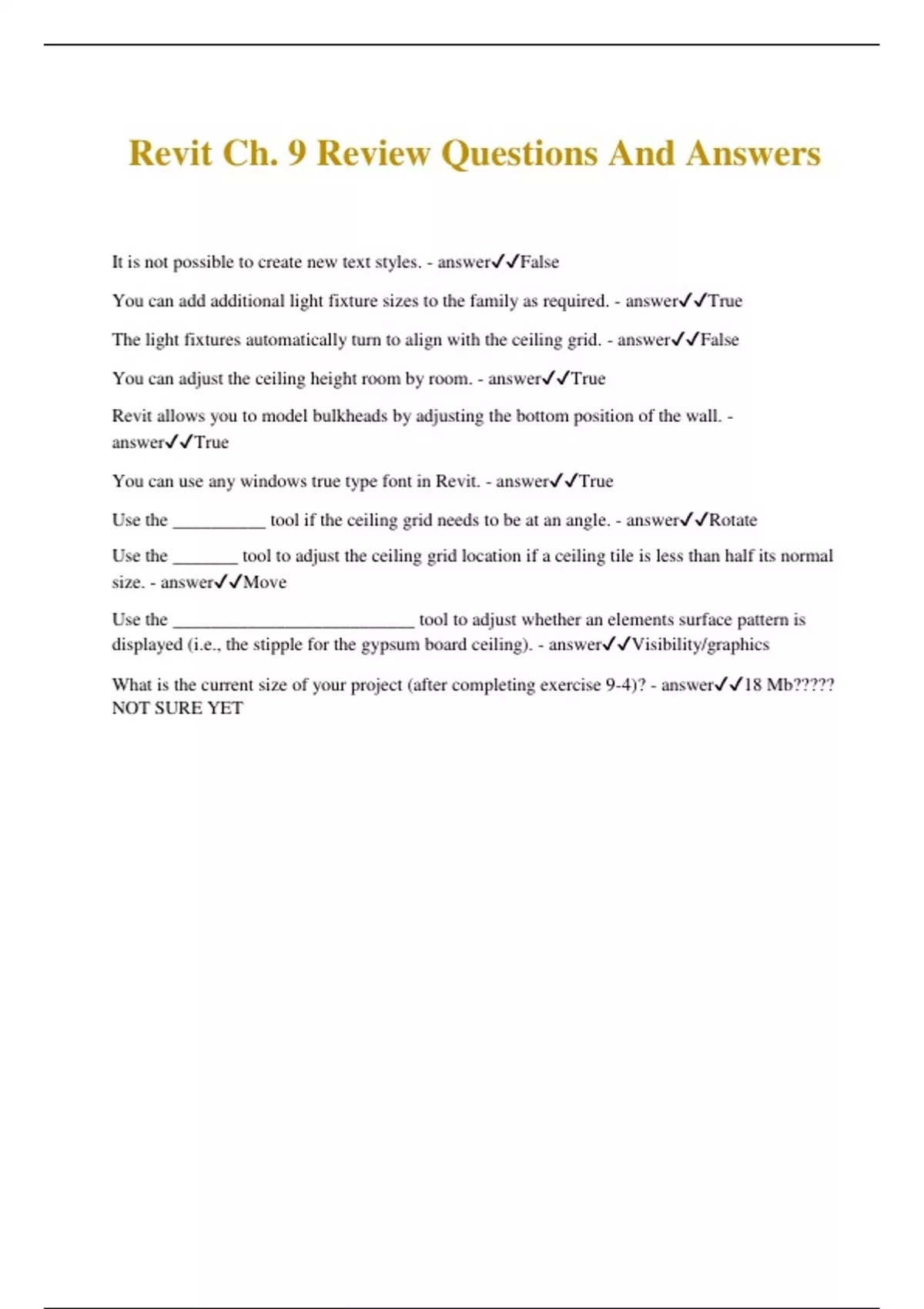 Revit Ch. 9 Review Questions And Answers It is not possible to create new text styles. - answerFalse You can add additional light fixture sizes to the family as required. - answerTrue The light fixtures automatically turn to align with the ceiling grid. - answerFalse You can adjust the ceiling height room by room. - answerTrue Revit allows you to model bulkheads by adjusting the bottom position of the wall. - answerTrue You can use any windows true type font in Revit. - answerTrue