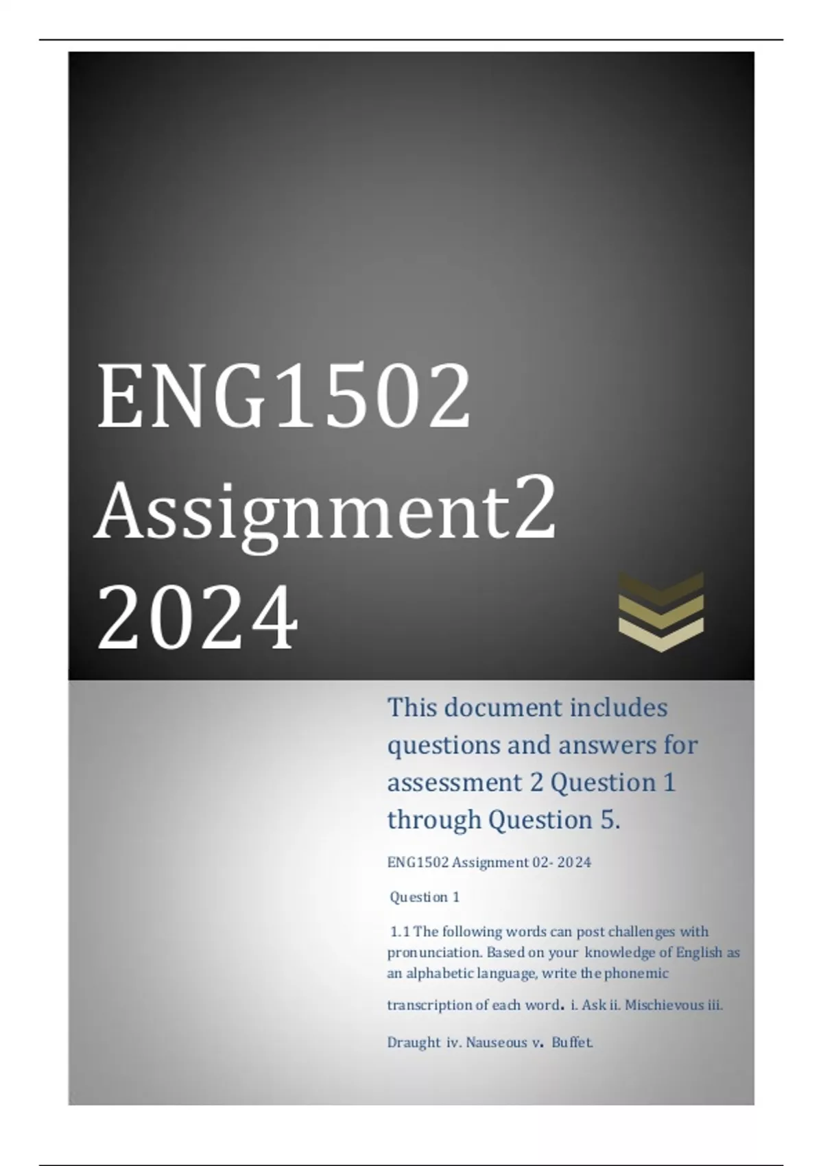 ENG1502 ASSESSMENT 2 DUE 2024..for assistance please whatapp 0.7.2.5.3.5.1.7.6.4..This document includes questions and answers for assessment 2 Question 1 through Question 5. ENG1502 Assignment 02- 2024 Question 1 1.1 The following words can post challenges with pronunciation. Based on your knowledge of English as an alphabetic language, write the phonemic transcription of each word. i. Ask ii. Mischievous iii. Draught iv. Nauseous v. Buffet. .