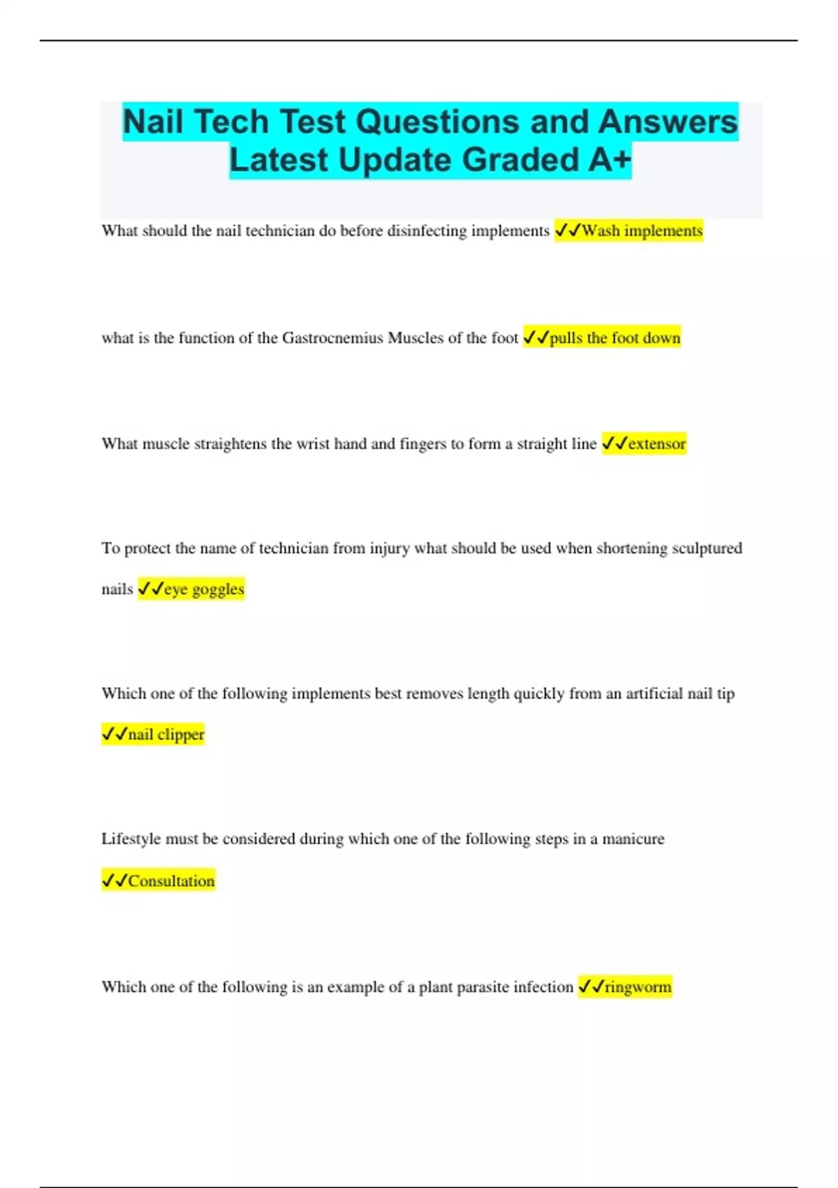Nail Tech Test Questions and Answers Latest Update Graded A+ What should the nail technician do before disinfecting implements Wash implements what is the function of the Gastrocnemius Muscles of the foot pulls the foot down What muscle straightens the wrist hand and fingers to form a straight line extensor To protect the name of technician from injury what should be used when shortening sculptured nails eye goggles Which one of the following implements best removes length quickly from an artificial nail tip nail clipper Lifestyle must be considered during which one of the following steps in a manicure Consultation Which one of the following is an example of a plant parasite infection ringworm What portion of the consultation helps determine whether it is safe to perform nail services on a client Medical information If the client is wearing nail tips which polish remover should be used non-acetone remover what is the name of circular Rhythmic movements used in basic or massage effleurage which implement should be used when cleaning under the free edge of the natural nail Cotton wrapped stick Through which one of the following instruments can bacteria be seen Microscope to prevent the spread of disease to know technician should clean up blood spills with which product hospital grade disinfectant What is another name for hangnail Agnail which does a nail technician add to the pedicure bate antibacterial soap What proteins make up the nail plate keratin What fights infection in the blood Red blood cells what does a disinfectant destroy bacteria What is the action of cuticle solvent softens the cuticle What liquid should be used to help the pusher pat and smooth a paper wrap nail enamel Hepatitis chickenpox influenza measles and mumps are all examples of what type of infection Viral To avoid ingrown toenails it is best to file the nails in which of the following manners straight across rounding slightly at the