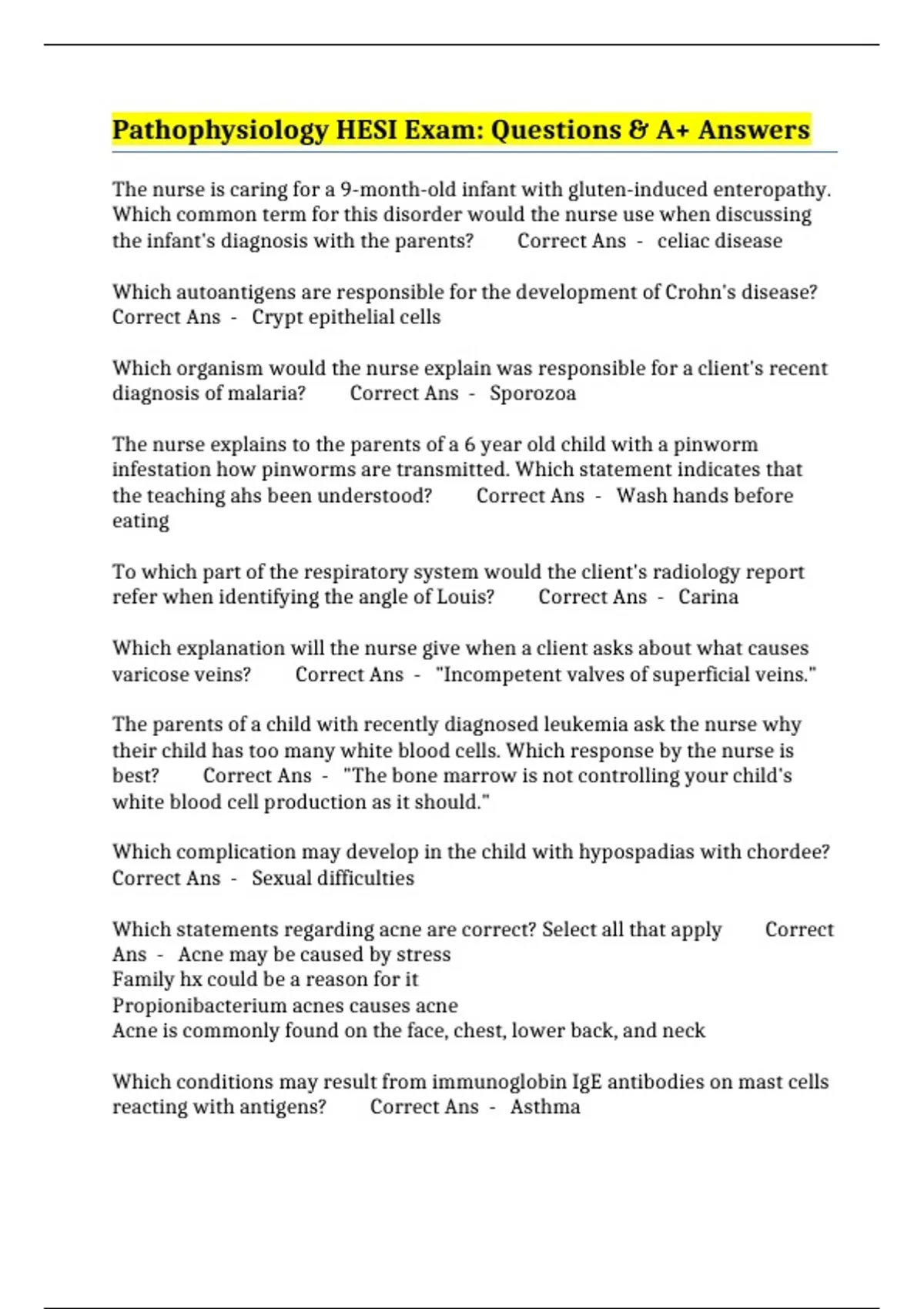 Pathophysiology HESI Exam: Questions & A+ Answers