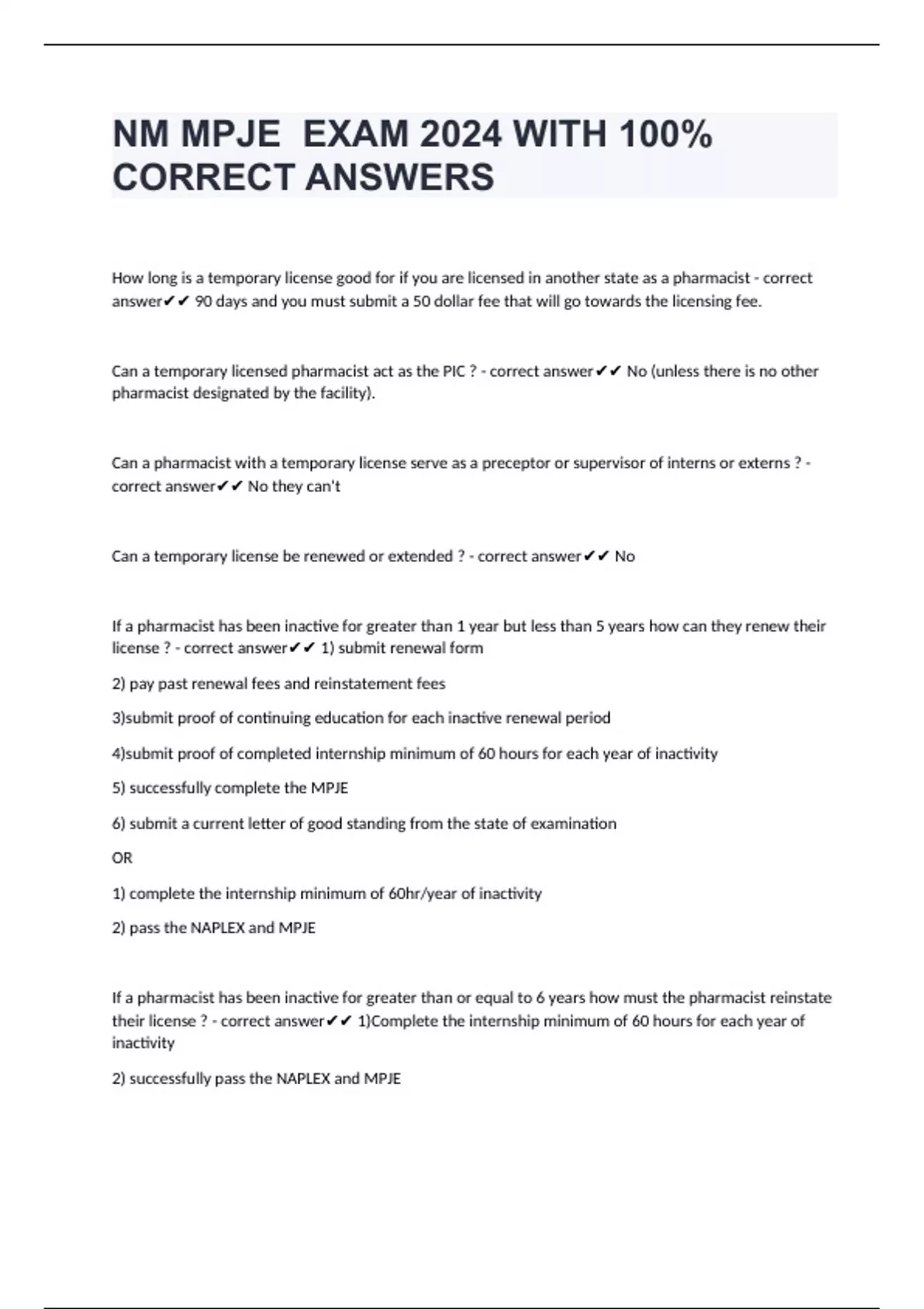 NM MPJE EXAM 2024 WITH 100% CORRECT ANSWERS How long is a temporary license good for if you are licensed in another state as a pharmacist - correct answer 90 days and you must submit a 50 dollar fee that will go towards the licensing fee. Can a temporary licensed pharmacist act as the PIC ? - correct answer No (unless there is no other pharmacist designated by the facility). Can a pharmacist with a temporary license serve as a preceptor or supervisor of interns or externs ? - correct answer No they can't Can a temporary license be renewed or extended ? - correct answer No If a pharmacist has been inactive for greater than 1 year but less than 5 years how can they renew their license ? - correct answer 1) submit renewal form 2) pay past renewal fees and reinstatement fees 3)submit proof of continuing education for each inactive renewal period 4)submit proof of completed internship minimum of 60 hours for each year of inactivity 5) successfully complete the MPJE 6) submit a current letter of good standing from the state of examination OR 1) complete the internship minimum of 60hr/year of inactivity 2) pass the NAPLEX and MPJE