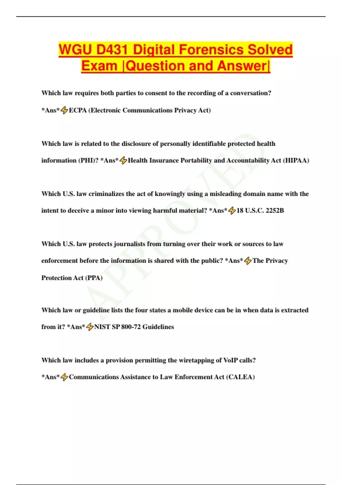 WGU D431 Digital Forensics Solved Exam |Question and Answer| Which law requires both parties to consent to the recording of a conversation? *Ans* ECPA (Electronic Communications Privacy Act) Which law is related to the disclosure of personally identifiable protected health information (PHI)? *Ans* Health Insurance Portability and Accountability Act (HIPAA) Which U.S. law criminalizes the act of knowingly using a misleading domain name with the intent to deceive a minor into viewing harmful material? *Ans* 18 U.S.C. 2252B Which U.S. law protects journalists from turning over their work or sources to law enforcement before the information is shared with the public? *Ans* The Privacy Protection Act (PPA) Which law or guideline lists the four states a mobile device can be in when data is extracted from it? *Ans* NIST SP 800-72 Guidelines Which law includes a provision permitting the wiretapping of VoIP calls? *Ans* Communications Assistance to Law Enforcement Act (CALEA) Which policy is included in the CAN-SPAM Act? *Ans* The email sender must provide some mechanism whereby the receiver can opt out of future emails and that method cannot require the receiver to pay in order to opt out. Which United States law requires telecommunications equipment manufacturers to provide built-in surveillance capabilities for federal agencies? *Ans* Communication Assistance to Law Enforcement Act (CALEA) Which law requires a search warrant or one of the recognized exceptions to the search warrant requirements for searching email messages on a computer? *Ans* The Fourth Amendment to the U.S. Constitution Where are local passwords stored for the Windows operating system? *Ans* SAM file in WindowsSystem32 Where on a Windows system is the config folder located that contains the SAM file? *Ans* C:WindowsSystem3