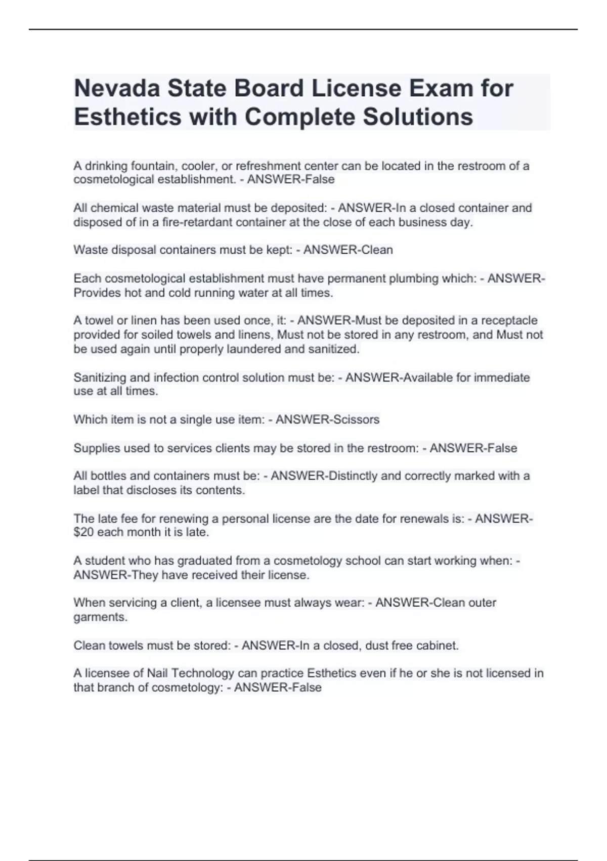 Nevada State Board License Exam for Esthetics with Complete Solutions Nevada State Board License Exam for Esthetics with Complete Solutions Nevada State Board License Exam for Esthetics with Complete Solutions Nevada State Board License Exam for Esthetics with Complete Solutions A drinking fountain, cooler, or refreshment center can be located in the restroom of a cosmetological establishment. - ANSWER-False All chemical waste material must be deposited: - ANSWER-In a closed container and disposed of in a fire-retardant container at the close of each business day. Waste disposal containers must be kept: - ANSWER-Clean Each cosmetological establishment must have permanent plumbing which: - ANSWER-Provides hot and cold running water at all times.