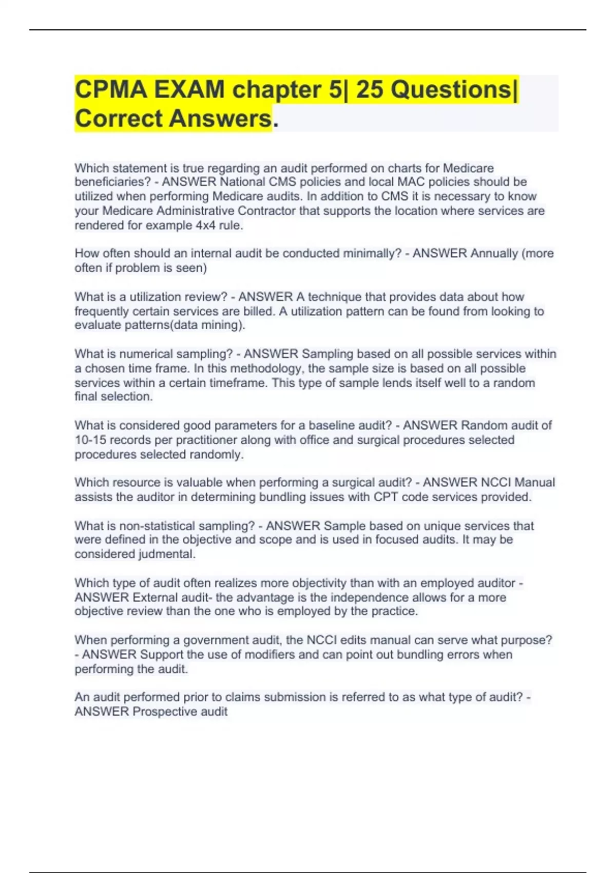 Which statement is true regarding an audit performed on charts for Medicare beneficiaries? - ANSWER National CMS policies and local MAC policies should be utilized when performing Medicare audits. In addition to CMS it is necessary to know your Medicare Administrative Contractor that supports the location where services are rendered for example 4x4 rule. How often should an internal audit be conducted minimally? - ANSWER Annually (more often if problem is seen) What is a utilization review? - ANSWER A technique that provides data about how frequently certain services are billed. A utilization pattern can be found from looking to evaluate patterns(data mining). What is numerical sampling? - ANSWER Sampling based on all possible services within a chosen time frame. In this methodology, the sample size is based on all possible services within a certain timeframe. This type of sample lends itself well to a random final selection. What is considered good parameters for a baseline audit? - ANSWER Random audit of 10-15 records per practitioner along with office and surgical procedures selected procedures selected randomly. Which resource is valuable when performing a surgical audit? - ANSWER NCCI Manual assists the auditor in determining bundling issues with CPT code services provided. What is non-statistical sampling? - ANSWER Sample based on unique services that were defined in the objective and scope and is used in focused audits. It may be considered judmental. Which type of audit often realizes more objectivity than with an employed auditor - ANSWER External audit- the advantage is the independence allows for a more objective review than the one who is employed by the practice. When performing a government audit, the NCCI edits manual can serve what purpose? - ANSWER Support the use of modifiers and can point out bundling errors when performing the audit. An audit performed prior to claims submission is referred to as what type of audit? - ANSWER Prospective audit