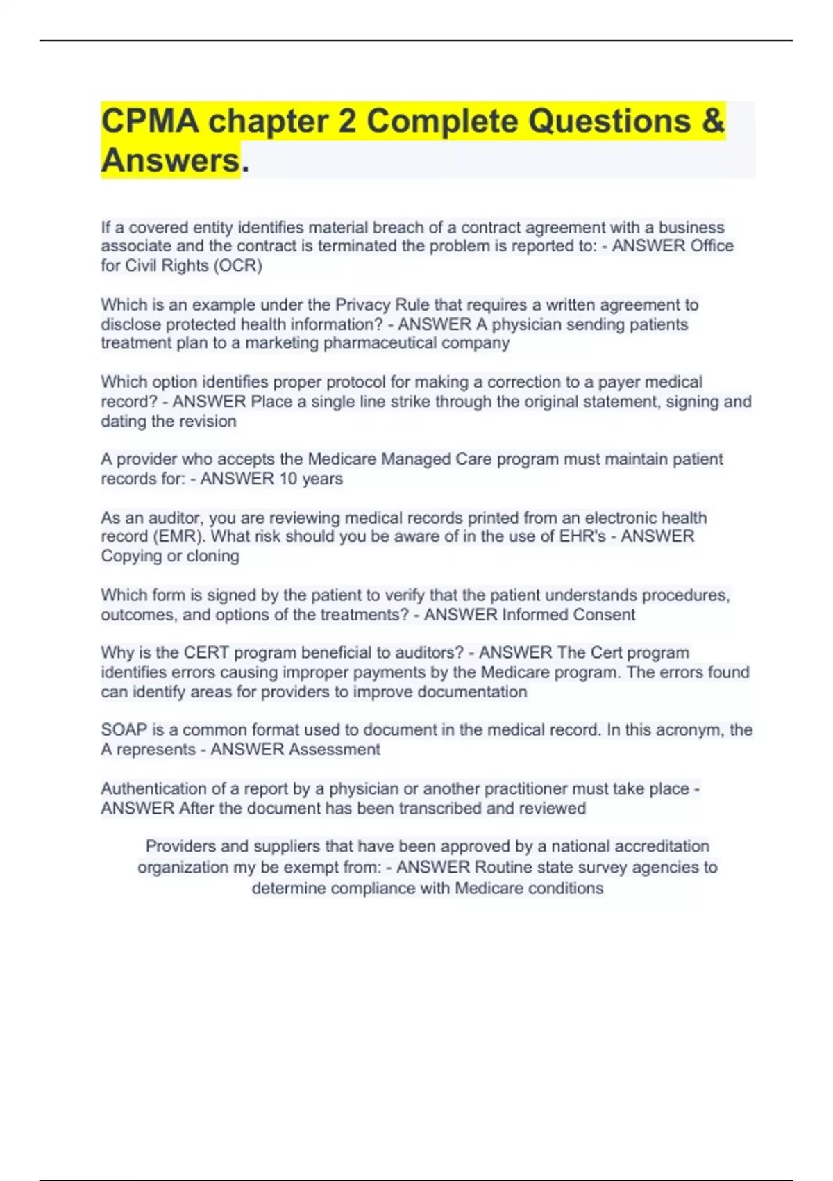 If a covered entity identifies material breach of a contract agreement with a business associate and the contract is terminated the problem is reported to: - ANSWER Office for Civil Rights (OCR) Which is an example under the Privacy Rule that requires a written agreement to disclose protected health information? - ANSWER A physician sending patients treatment plan to a marketing pharmaceutical company Which option identifies proper protocol for making a correction to a payer medical record? - ANSWER Place a single line strike through the original statement, signing and dating the revision A provider who accepts the Medicare Managed Care program must maintain patient records for: - ANSWER 10 years As an auditor, you are reviewing medical records printed from an electronic health record (EMR). What risk should you be aware of in the use of EHR's - ANSWER Copying or cloning Which form is signed by the patient to verify that the patient understands procedures, outcomes, and options of the treatments? - ANSWER Informed Consent Why is the CERT program beneficial to auditors? - ANSWER The Cert program identifies errors causing improper payments by the Medicare program. The errors found can identify areas for providers to improve documentation SOAP is a common format used to document in the medical record. In this acronym, the A represents - ANSWER Assessment Authentication of a report by a physician or another practitioner must take place - ANSWER After the document has been transcribed and reviewed
