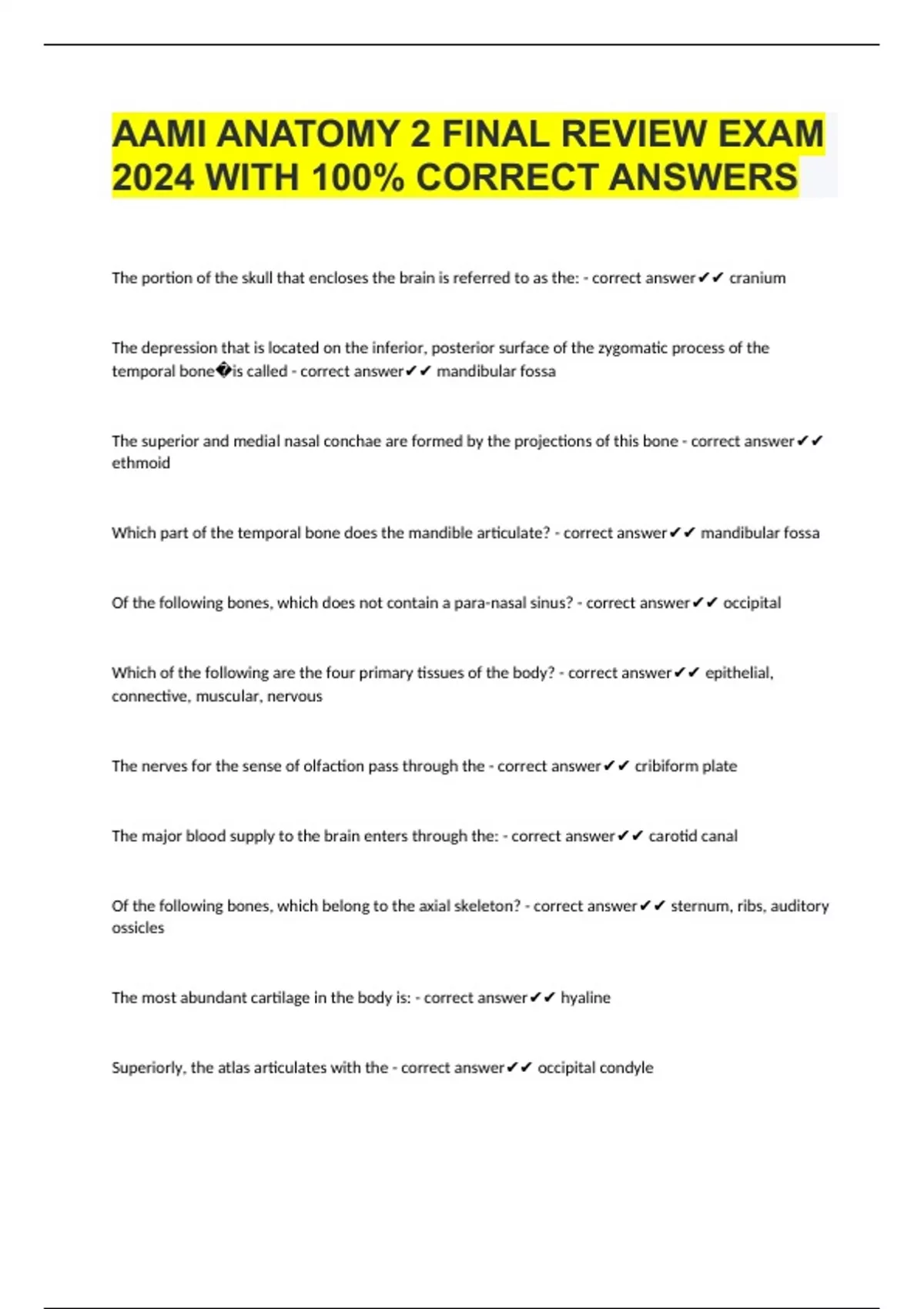 AAMI ANATOMY 2 FINAL REVIEW EXAM 2024 WITH 100% CORRECT ANSWERS The portion of the skull that encloses the brain is referred to as the: - correct answer cranium The depression that is located on the inferior, posterior surface of the zygomatic process of the temporal bone�is called - correct answer mandibular fossa The superior and medial nasal conchae are formed by the projections of this bone - correct answer ethmoid Which part of the temporal bone does the mandible articulate? - correct answer mandibular fossa Of the following bones, which does not contain a para-nasal sinus? - correct answer occipital Which of the following are the four primary tissues of the body? - correct answer epithelial, conne