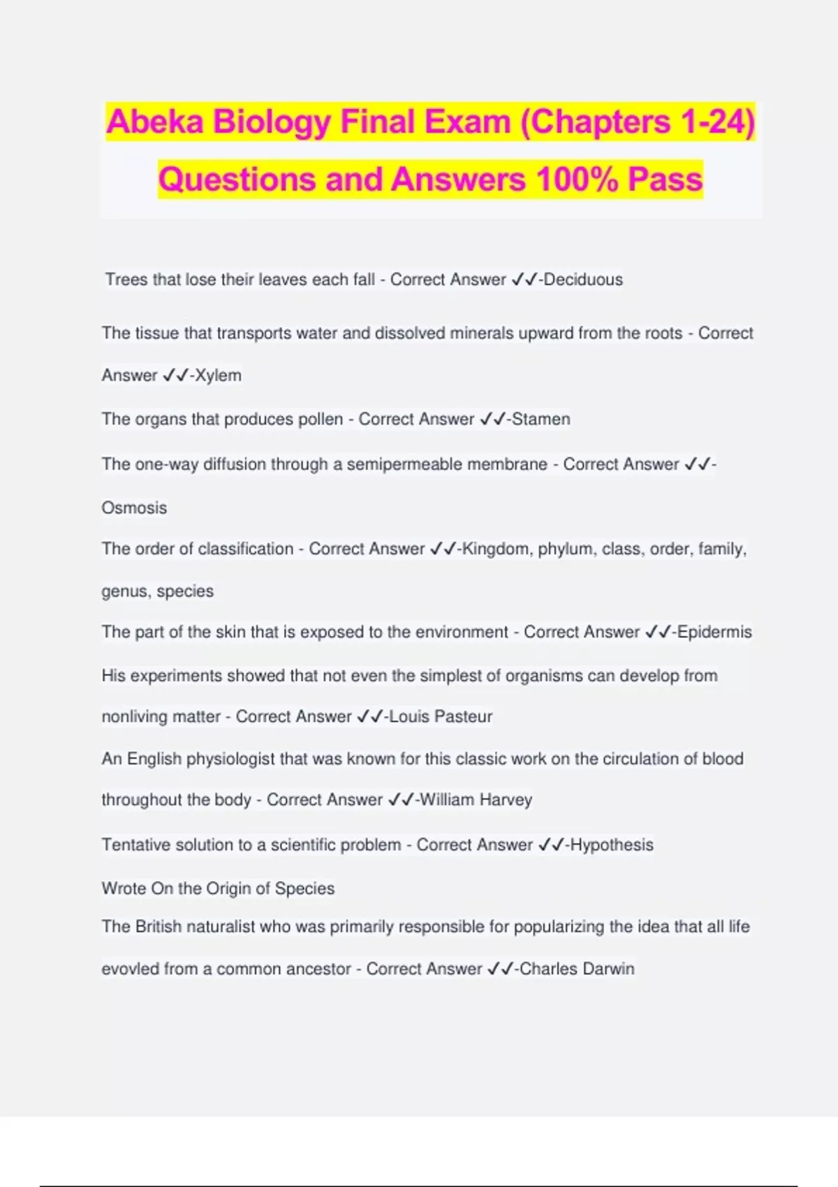 Abeka Biology Final Exam (Chapters 1-24) Questions and Answers 100% Pass Trees that lose their leaves each fall - Correct Answer ️️ -Deciduous The tissue that transports water and dissolved minerals upward from the roots - Correct Answer ️️ -Xylem The organs that produces pollen - Correct Answer ️️ -Stamen The one-way diffusion through a semipermeable membrane - Correct Answer ️️ - Osmosis The order of classification - Correct Answer ️️ -Kingdom, phylum, class, order, family, genus, species The part of the skin that is exposed to the environment - Correct Answer ️️ -Epidermis His experiments showed that not even the simplest of organisms can develop from nonliving matter - Correct Answer ️️ -Louis Pasteur An English physiologist that was known for this classic work on the circulation of blood throughout the body - Correct Answer ️️ -William Harvey Tentative solution to a scientific problem - Correct Answer ️️ -Hypothesis Wrote On the Origin of Species The British naturalist who was primarily responsible for popularizing the idea that all life evovled from a common ancestor - Correct Answer ️️ -Charles Darwin The hypothetical arrangement of fossils allegedly demonstrating evolution in the fossil record - Correct Answer ️️ -Geologic column "Early human" that was actually an extinct pig - Correct Answer ️️ -Nebraska man "Handy man" Actually a mixture of human fossils and ape fossils - Correct Answer ️️ -Homo habilis The two things that biomes are identified by - Correct Answer ️️ -Climax vegetation, and animal species that dwell there Consumers that feed on plants - Correct Answer ️️ -Herivores The function or "occupation" of a living thing - Correct Answer ️️ -Niche The cycle water goes through (evaporation, condensation, and precipitation) - Correct Answer ️️ -Hydrologic cycle Has long, harsh winters with freezing temperatures and permafrost - Correct Answer ️️ -Arctic tundra Found near the equator and receive abundant rain - Correct Answer ️️ -Tropical rain forests All vertebrates have this symmetry - Correct Answer ️️ -Bilateral symmetry Egg-laying mammals - Correct Answer ️️ -Oviparous The slowest land mammal - Correct Answer ️️ -Sloths Active at night - Correct Answer ️️ -Nocturnal Primates without tails - Correct Answer ️️ -Apes The largest rodent - Correct Answer ️️ -Capybaras Horses, tapirs, and rhinos Have odd number of functional toes - Correct Answer ️️ -Perissodactyla Solid bone An animal that has this will shed its velvet before the breeding season - Correct Answer ️️ -Antlers Meat eaters - Correct Answer ️️ -Carnivores Considered the largest land-dwelling carnivore - Correct Answer ️️ -Alaskan brown bear Soft, fluffy feathers close to the body - Correct Answer ️️ -Down feathers The third eyelid of a bird - Correct Answer ️️ -Nictitating membrane The twisted cord that keeps the yolk of a bird egg properly oriented for the development of the embryo - Correct Answer ️️ -Chalaza Legless vertebrate with nictitating membrane - Correct Answer ️️ -Snake The large fin that serves as a fish's propeller and rudder - Correct Answer ️️ -Caudul fin The organs on each side of a fish's head that allows the fish to extract oxygen from the water - Correct Answer ️️ -Gills Allows a fish to adjust its bouyancy so that it can remain stationa