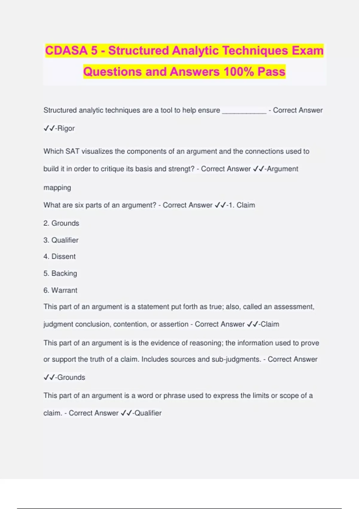 CDASA 5 - Structured Analytic Techniques Exam Questions and Answers 100% Pass Structured analytic techniques are a tool to help ensure ___________ - Correct Answer ️️ -Rigor Which SAT visualizes the components of an argument and the connections used to build it in order to critique its basis and strengt? - Correct Answer ️️ -Argument mapping What are six parts of an argument? - Correct Answer ️️ -1. Claim 2. Grounds 3. Qualifier 4. Dissent 5. Backing 6. Warrant This part of an argument is a statement put forth as true; also, called an assessment, judgment conclusion, contention, or assertion - Correct Answer ️️ -Claim This part of an argument is is the evidence of reasoning; the information used to prove or support the truth of a claim. Includes sources and sub-judgments. - Correct Answer ️️ -Grounds This part of an argument is a word or phrase used to express the limits or scope of a claim. - Correct Answer ️️ -Qualifier This part of an argument is a refutation or challenge to a claim. - Correct Answer ️️ - Dissent This part of an argument is further reasoning presented to justify a warrant; used when the authority of grounds/justification for relevance is in question or not accepted - Correct Answer ️️ -Backing This part of an argument identifies the logical connection between grounds and the supported claim, justifying the connection. Answers the question "why is this relevant to the claim or judgment." Often left implicit because they are obvious. - Correct Answer ️️ -Warrant Every argument map is focused on one primary ________ - Correct Answer ️️ - Claim/judgment/hypothesis The claim is supported by (the) _____________ and include evidence, reasoning, assumptions, and inference. - Correct Answer ️️ -Grounds Warrants are represented by _______ on an argument map that connect the ____ to the _____ - Correct Answer ️️ -Lines, Claim, Grounds What are the three forms of resolution to dissent? - Correct Answer ️️ -1. Refute 2. Concession 3. Prove irrelevance When should an analyst use argument mapping? - Correct Answer ️️ -After analysis and to understand an argument's strength - product evaluation