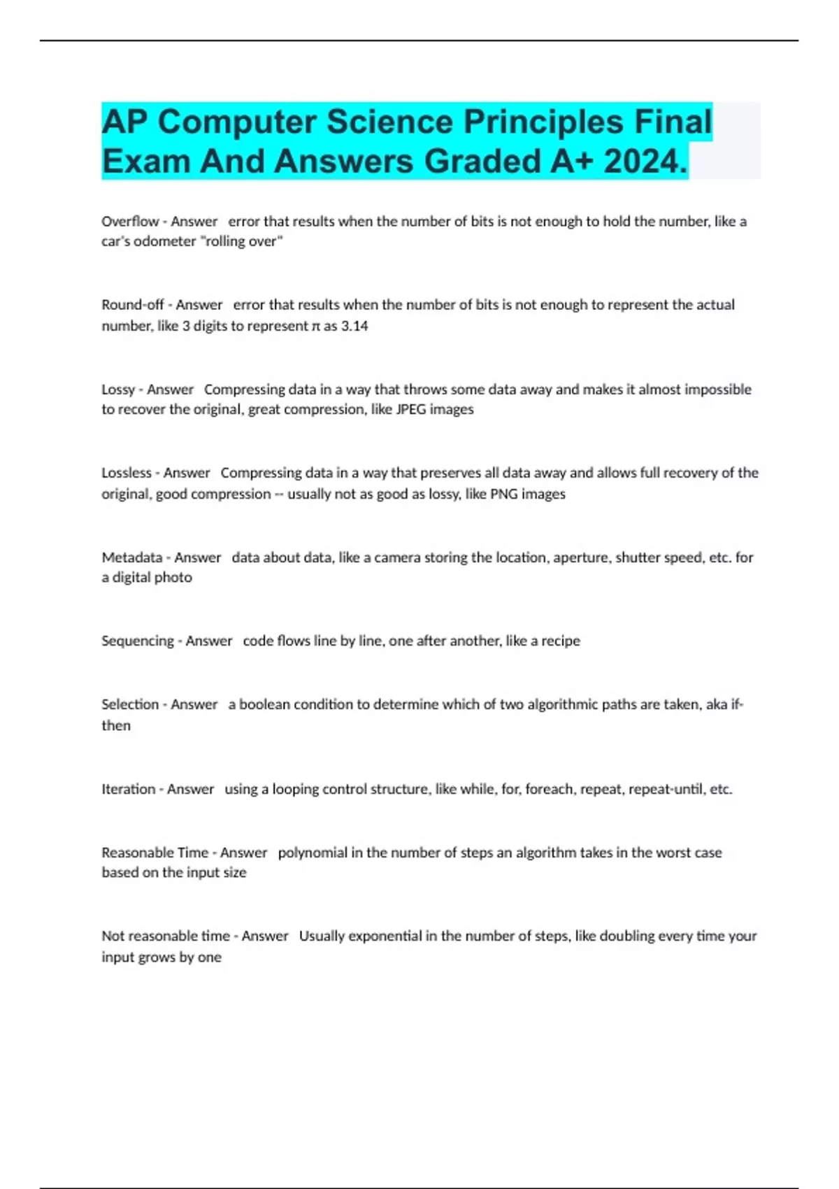 Overflow - Answer error that results when the number of bits is not enough to hold the number, like a car's odometer "rolling over" Round-off - Answer error that results when the number of bits is not enough to represent the actual number, like 3 digits to represent π as 3.14 Lossy - Answer Compressing data in a way that throws some data away and makes it almost impossible to recover the original, great compression, like JPEG images Lossless - Answer Compressing data in a way that preserves all data away and allows full recovery of the original, good compression -- usually not as good as lossy, like PNG images Metadata - Answer data about data, like a camera storing the location, aperture, shutter speed, etc. for a digital photo Sequencing - Answer code flows line by line, one after another, like a recipe Selection - Answer a boolean condition to determine which of two algorithmic paths are taken, aka if-then Iteration - Answer using a looping control structure, like while, for, foreach, repeat, repeat-until, etc. Reasonable Time - Answer polynomial in the number of steps an algorithm takes in the worst case based on the input size Not reasonable time - Answer Usually exponential in the number of steps, like doubling every time your input grows by one