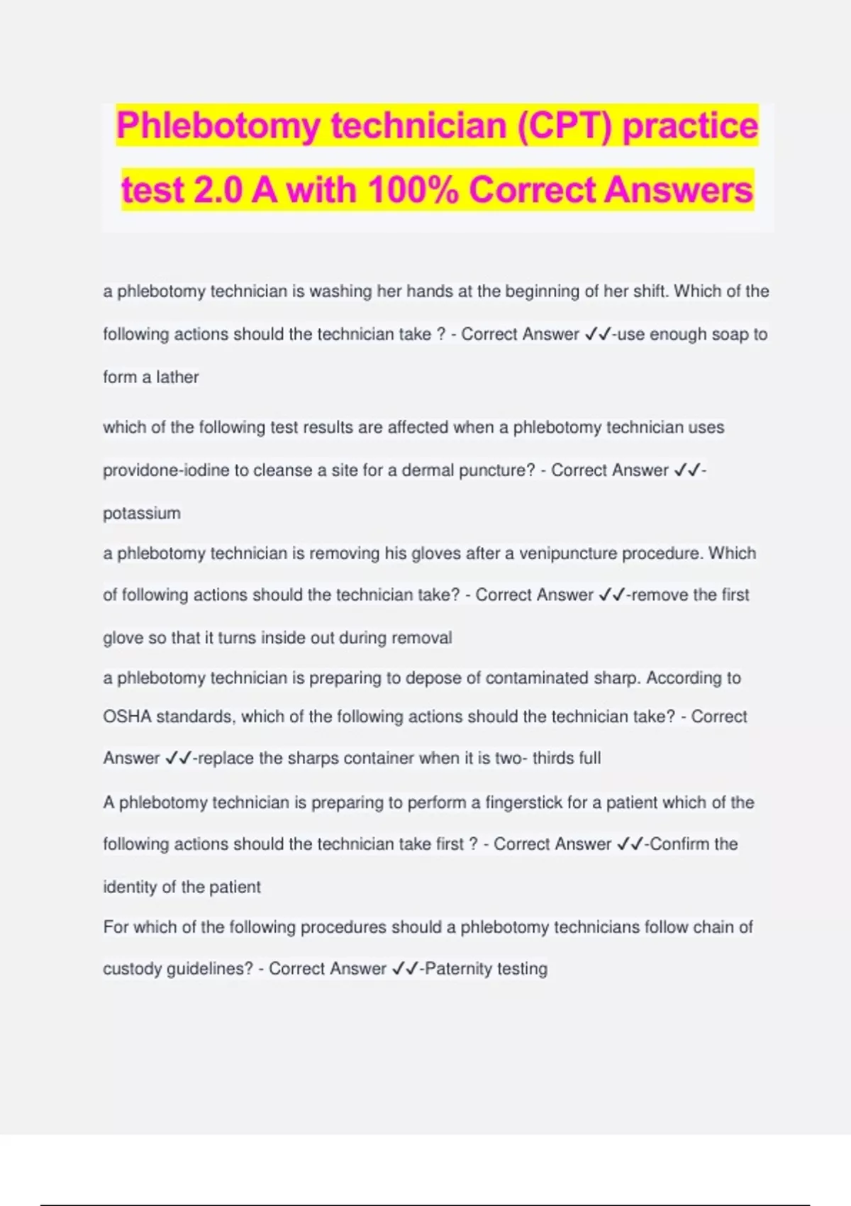 Phlebotomy technician (CPT) practice test 2.0 A with 100% Correct Answers a phlebotomy technician is washing her hands at the beginning of her shift. Which of the following actions should the technician take ? - Correct Answer ️️ -use enough soap to form a lather which of the following test results are affected when a phlebotomy technician uses providone-iodine to cleanse a site for a dermal puncture? - Correct Answer ️️ - potassium a phlebotomy technician is removing his gloves after a venipuncture procedure. Which of following actions should the technician take? - Correct Answer ️️ -remove the first glove so that it turns inside out during removal a phlebotomy technician is preparing to depose of contaminated sharp. According to OSHA standards, which of the following actions should the technician take? - Correct Answer ️️ -replace the sharps container when it is two- thirds full A phlebotomy technician is preparing to perform a fingerstick for a patient which of the following actions should the technician take first ? - Correct Answer ️️ -Confirm the identity of the patient For which of the following procedures should a phlebotomy technicians follow chain of custody guidelines? - Correct Answer ️️ -Paternity testing after exiting a patients room, which of the following is the last piece of personal protective equipment (PPE) a phlebotomy technician should remove? - Correct Answer ️️ -Mask After verifying a patient's identity, a phlebotomy technician sees that the patient's laboratory results are ready. Which of the following actions should the technician take ? - Correct Answer ️️ -Inform the patient to contact the ordering provider to obtain the results A Phlebotomy Technician should comply with HIPPA to protect which of the following ? - Correct Answer ️️ -Patient's information A phlebotomy technician should select a tube that has which of the following anticoagulants to collect a sample for a PT/PTT test ? - Correct Answer ️️ -sodium citrate A phlebotomy technician is using an evacuated needle holder and blood collection tunes to collect blood from a patient. which of the following actions the technician take ? - Correct Answer ️️ -push the first collection tube gently in the holder a phlebotomy technician is disposing of used supplies when he accidentally receives a needlestick injury. According to OSHA guidelines . Which of the following actions should the technician take first? - Correct Answer ️️ -wash the puncture site with soap and water A phlebotomy technician is preparing draw from a patient in an inpatient setting. The patient extends his arm and turns his head away. This action by the patient is an example of which of the following types of consent? - Correct Answer ️️ -Implied consent When should a phlebotomy technician perform external liquid controls for quality control on a clia-waived glucose point-of-care test ? - Correct Answer ️️ -When a new lot number or kit is opened A phlebotomy technician is performing a venipuncture for a patient who begins to seize. Which of the following actions should the technician take ? - Correct Answer ️️ - Discountinue the draw a phlebotomy technician is preparing to draw blood from a patient's arm and observes a sore at the site where the tourniquet is to be placed. Which of the following actions should the technician take? - Correct Answer ️️ -Tie the tourniquet over the patient's sleeve Which of the following tubes should a phlebotomy technician collect first when obtaining dermal samples - Correct Answer ️️ -Lavender top a phlebotomy technician is verifying a patient's identity before performing a venipuncture procedure. Which of the following information should the technician request from the patient? - Correct Answer ️️ -The patient's full name and date of birth Prior to transport, which of the following specimens should a phlebotomy technician place in an ice bath within 30 minutes after collection? - Correct Answer ️️ -Arterial blood gas A phlebotomy technician is preparing several specimens for transport to the facility's laboratory. Which of the following specimens should the technician protect from bright light by placing it in an amber/Brown biohazard bag for transport? - Correct Answer ️️ - Vitamin B 6 A phlebotomy technician is preparing a peripheral blood smear from a patient's capillary blood. Which of the following actions should the technician take ? - Correct Answer ️️ - Use the second drop of blood that emerges from the puncture A phlebotomy technician is obtaining a blood culture specimen from an adult patient. Which of the following actions should the technician take ? - Correct Answer ️️ - withdraw the blood into a sterile safety syringe A phlebotomy technician is collecting blood from a patient for donation. The collecting bag only fills halfway and the vein collapses. Which of the following actions should the technician take ? - Correct Answer ️️ -Use a new collection bag to draw a new unit of blood Which of the following sources for patient identification should a phlebotomy technician use in an Impatient setting? - Correct Answer ️️ -Verbal and wristband According to OSHA standards, which of the following vaccines must employers offer to their phlebotomists at no cost? - Correct Answer ️️ -Hepatitis B A phlebotomy technician uses alcohol to cleanse a venipuncture site. Before performing the venipunctures the technician should allow the site to dry for which of the following reasons? - Correct Answer ️️ -Alcohol requires time for antiseptic action to test effect A phlebotomy technician is preparing to draw blood from a patient who states that this is his first blood draw. Which of the following actions should the technician take ? - Correct Answer ️️ -Describe the procedure to the patient A phlebotomy technician should identify that which of the following colors signifies a health hazard in the national 