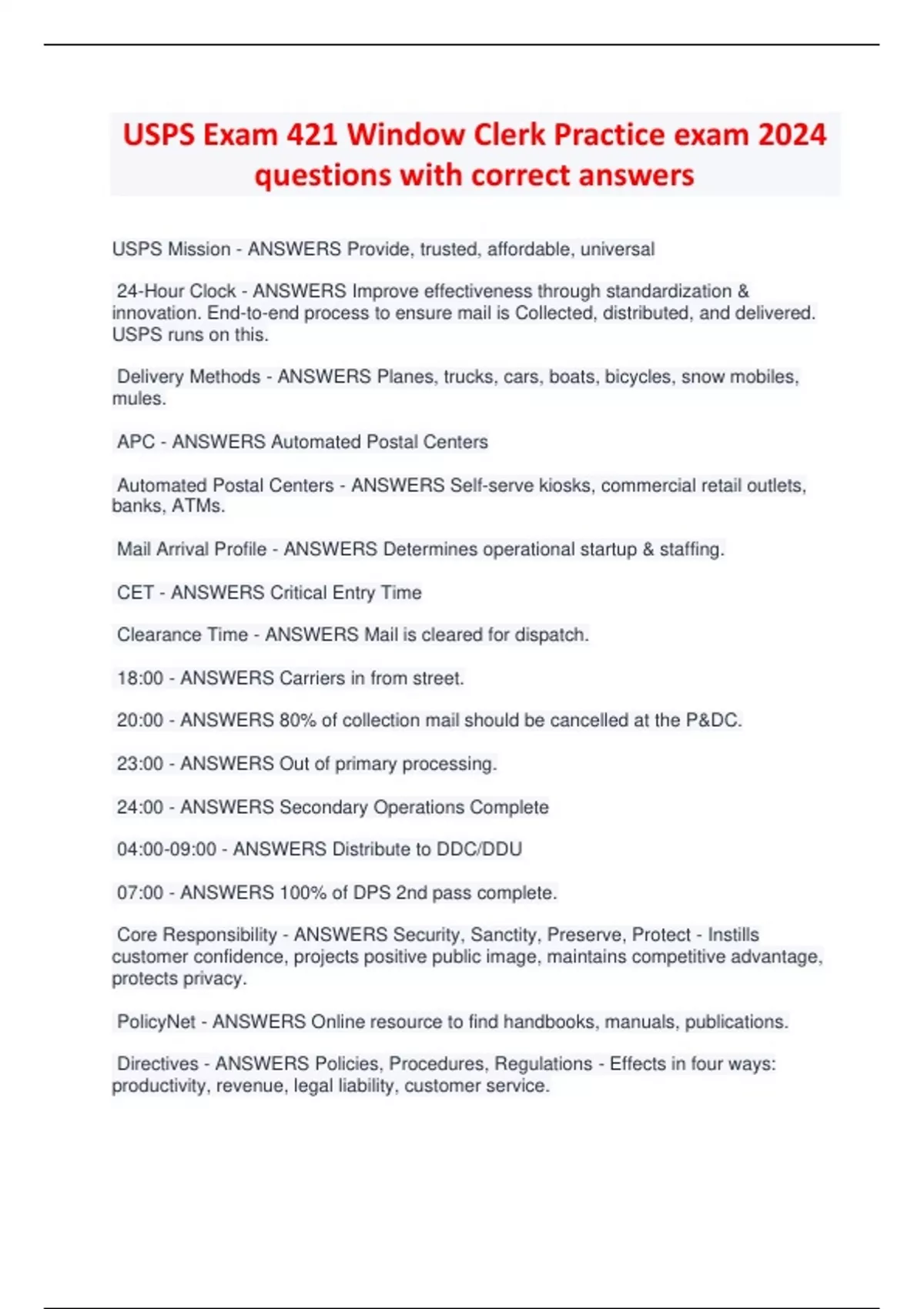 USPS Exam 421 Window Clerk Practice exam 2024 questions with correct answers USPS Mission - ANSWERS Provide, trusted, affordable, universal 24-Hour Clock - ANSWERS Improve effectiveness through standardization & innovation. End-to-end process to ensure mail is Collected, distributed, and delivered. USPS runs on this. Delivery Methods - ANSWERS Planes, trucks, cars, boats, bicycles, snow mobiles, mules. APC - ANSWERS Automated Postal Centers Automated Postal Centers - ANSWERS Self-serve kiosks, commercial retail outlets, banks, ATMs. Mail Arrival Profile - ANSWERS Determines operational startup & staffing. CET - ANSWERS Critical Entry Time Clearance Time - ANSWERS Mail is cleared for dispatch. 18:00 - ANSWERS Carriers in from street. 20:00 - ANSWERS 80% of collection mail should be cancelled at the P&DC. 23:00 - ANSWERS Out of primary processing. 24:00 - ANSWERS Secondary Operations Complete 04:00-09:00 - ANSWERS Distribute to DDC/DDU 07:00 - ANSWERS 100% of DPS 2nd pass complete. Core Responsibility - ANSWERS Security, Sanctity, Preserve, Protect - Instills customer confidence, projects positive public image, maintains competitive advantage, protects privacy. PolicyNet - ANSWERS Online resource to find handbooks, manuals, publications. Directives - ANSWERS Policies, Procedures, Regulations - Effects in four ways: productivity, revenue, legal liability, customer service. DMM - ANSWERS Domestic Mail Manual Domestic Mail Manual - ANSWERS DMM - Policies, procedures and regulatins for domestic mail. Information on extra services, postage prices, mail classes. IMM - ANSWERS International Mail Manual International Mail Manual - ANSWERS IMM - Mailing conditions for each country, also includes a list of countries. ASM - ANSWERS Adminstrative Support Manual Administrative Support Manual - ANSWERS Policies, procedures for adminstrative and support functions. Information covering audits, investigations, communication, facilities, equipment and privacy. POM - ANSWERS Postal Operations Manual Postal Operations Manual - ANSWERS Operations function of field organizations. Information regarding retail, philatelic, collection, mail processing, transportation, delivery, vehical operation. ELM - ANSWERS Employee & Labor Relations Manual Employee & Labor Relations Manual - ANSWERS Personnel policies and regulations. Employee placement, pay, benefits, training, health and environment, labor relations. F101 - ANSWERS Field Accounting Procedures AS or MS - ANSWERS Handbook ID for Administrative Support Manual (ASM) DM - ANSWERS Handbook ID for Domestic Mail Manual (DMM) EL or P - ANSWERS Handbook ID for Employee & Labor Relations Manual (ELM) M - ANSWERS Handbook ID for Postal Operations Manual (POM) or Administrative Support Manual (ASM) PO - ANSWERS Handbook ID for Postal Operations Manual (POM) Publications - ANSWERS Primarily for public, marketing and mail guidelines. Postal Bulletin - ANSWERS Official source of updates and amendments to current directives. Can be accessed through PolicyNet. Biweekly. Postal Forms - ANSWERS Can be searched by title or number. Website also provides links to OPM, GSA, TSH, OSHA, OWCP. Publication 223 - ANSWERS Information regarding directives and forms catalog. #1 Business Goal - ANSWERS Strengthening customer relationship. Value, Exceptional Service, Reliability - ANSWERS Will increase revenue, missed opportunity is missed revenue, quality end-to-end service. Building Customer Relationship - ANSWERS Positive attitude, Listening, Communication, Adapting to change, Knowledge of products, Soliciting customer feedback. What the postal service offers - ANSWERS Better value, presence in every community, USPS.com, competitive pricing incentives. Shipping Services - ANSWERS Priority, Express, Parcel Select, Parcel Return Service, International Mail Parcel Select - ANSWERS Entry points at DDU, SCF, NDC. Optional hold for pickup. Pricing and volume incentives. Parcel Return Service - ANSWERS Consumer return me