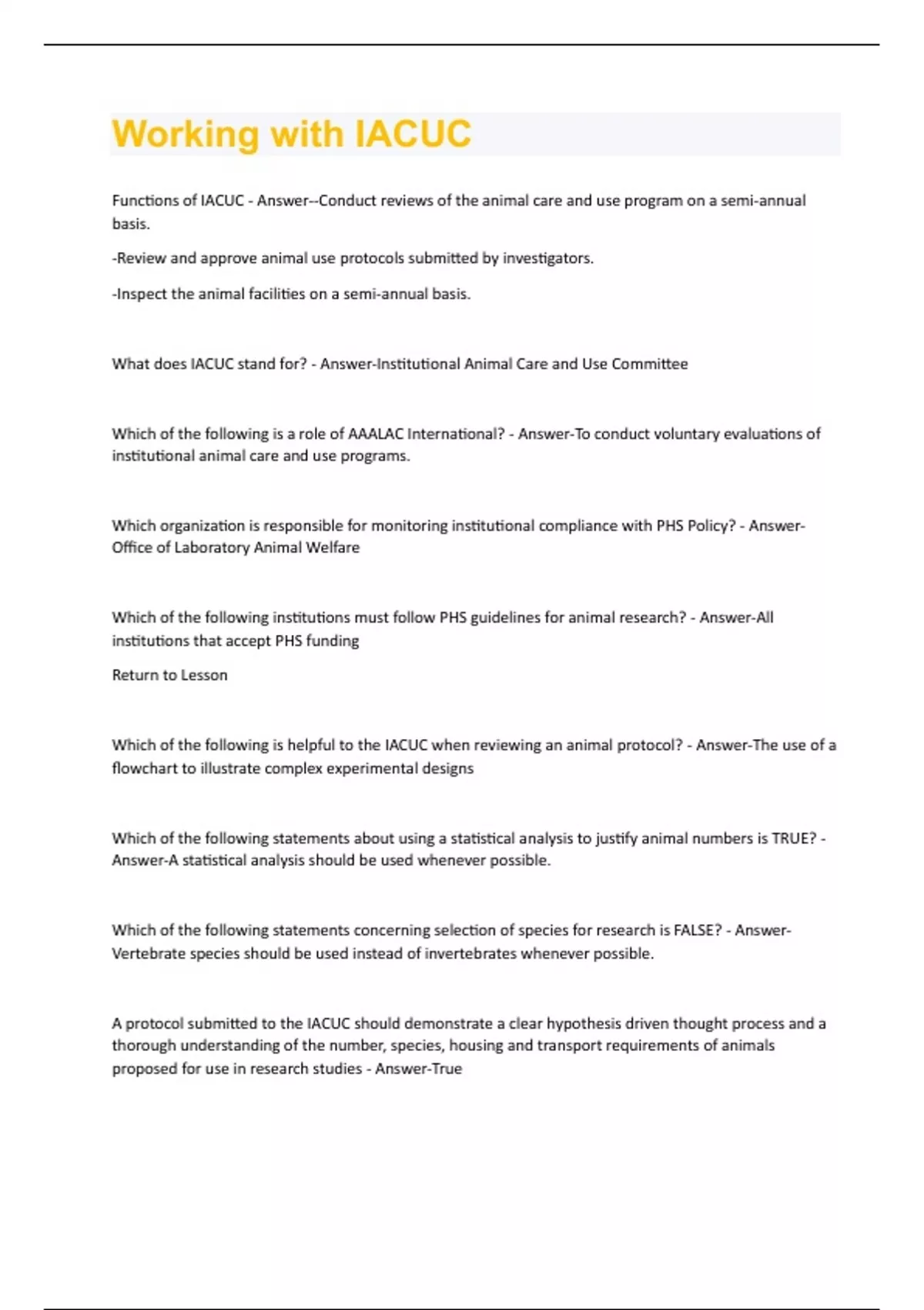 Functions of IACUC - Answer--Conduct reviews of the animal care and use program on a semi-annual basis. -Review and approve animal use protocols submitted by investigators. -Inspect the animal facilities on a semi-annual basis. What does IACUC stand for? - Answer-Institutional Animal Care and Use Committee Which of the following is a role of AAALAC International? - Answer-To conduct voluntary evaluations of institutional animal care and use programs. Which organization is responsible for monitoring institutional compliance with PHS Policy? - AnswerOffice of Laboratory Animal Welfare Which of the following institutions must follow PHS guidelines for animal research? - Answer-All institutions that accept PHS funding Return to Lesson Which of the following is helpful to the IACUC when reviewing an animal protocol? - Answer-The use of a flowchart to illustrate complex experimental designs Which of the following statements about using a statistical analysis to justify animal numbers is TRUE? - Answer-A statistical analysis should be used whenever possible. Which of the following statements concerning selection of species for research is FALSE? - AnswerVertebrate species should be used instead of invertebrates whenever possible. A protocol submitted to the IACUC should demonstrate a clear hypothesis driven thought process and a thorough understanding of the number, species, housing and transport requirements of animals proposed for use in research studies - Answer-TrueWhich of the following is an example of refinement per the three Rs of Russell and Burch? - Answer-The use of a new blood collection technique that causes less pain and distress Which of the following is NOT an example of reduction per the three Rs of Russell and Burch? - AnswerThe use of a new anesthetic that provides better induction and a shorter recovery period The three Rs of Russell and Burch stand for what? - Answer-Replacement, reduction, and refinement The Animal Welfare Regulations require the IACUC to do what two things regarding alternatives? - Answer-Ensure that the principal investigator has considered alternatives to painful or distressing procedures, and review a written assurance that alternatives are not available. What is a primary mission of the Animal Welfare Information Center (AWIC), a part of USDA? - Answer-To provide assistance with alternatives and database searches. The Johns Hopkins Center for Alternatives to Animal Testing (CAAT), the Institute for In Vitro Sciences, and the European Center for Validation of Alternative Methods (ECVAM) are primarily interested in what area? - Answer-Performing or sponsoring research into alternatives to animal use for research and testing. Endpoint criteria describe when it is time to do what? - Answer-Intervene to remove an animal from a study, sometimes by euthanizing an animal What is the basis for the pain/distress classification system used by most institutions? - Answer-USDA pain/distress categories Which activity would place a study in pain category B? - Answer-Use as a breeder