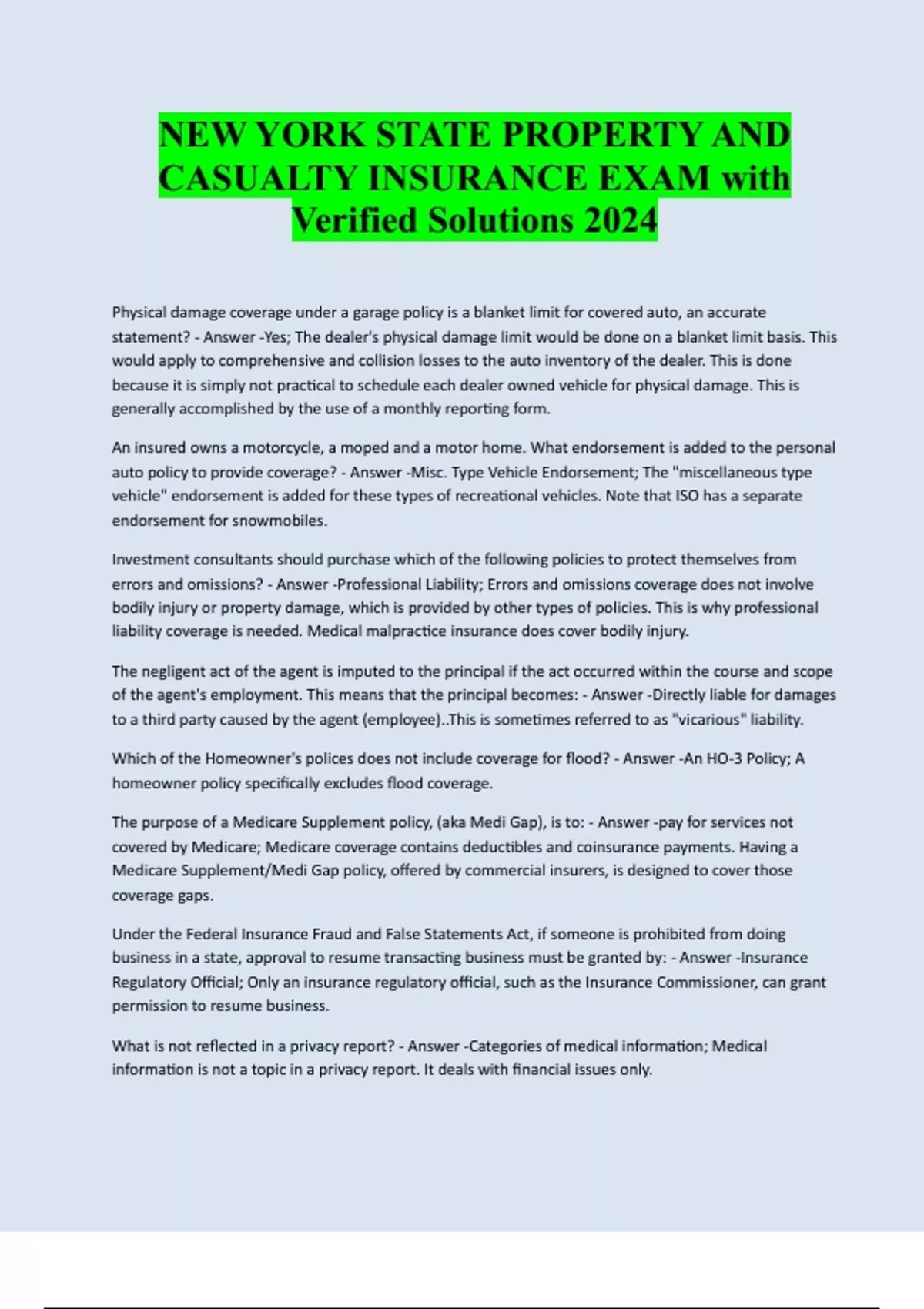 NEW YORK STATE PROPERTY AND CASUALTY INSURANCE EXAM with Verified Solutions 2024 Physical damage coverage under a garage policy is a blanket limit for covered auto, an accurate statement? - Answer -Yes; The dealer's physical damage limit would be done on a blanket limit basis. This would apply to comprehensive and collision losses to the auto inventory of the dealer. This is done because it is simply not practical to schedule each dealer owned vehicle for physical damage. This is generally accomplished by the use of a monthly reporting form. An insured owns a motorcycle, a moped and a motor home. What endorsement is added to the personal auto policy to provide coverage? - Answer -Misc. Type Vehicle Endorsement; The "miscellaneous type vehicle" endorsement is added for these types of recreational vehicles. Note that ISO has a separate endorsement for snowmobiles. Investment consultants should purchase which of the following policies to protect themselves from errors and omissions? - Answer -Professional Liability; Errors and omissions coverage does not involve bodily injury or property damage, which is provided by other types of policies. This is why professional liability coverage is needed. Medical malpractice insurance does cover bodily injury. The negligent act of the agent is imputed to the principal if the act occurred within the course and scope of the agent's employment. This means that the principal becomes: - Answer -Directly liable for damages to a third party caused by the agent (employee)..This is sometimes referred to as "vicarious" liability. Which of the Homeowner's polices does not include coverage for flood? - Answer -An HO-3 Policy; A homeowner policy specifically excludes flood coverage. The purpose of a Medicare Supplement policy, (aka Medi Gap), is to: - Answer -pay for services not covered by Medicare; Medicare coverage contains deductibles and coinsurance payments. Having a Medicare Supplement/Medi Gap policy, offered by commercial insurers, is designed to cover those coverage gaps. Under the Federal Insurance Fraud and False Statements Act, if someone is prohibited from doing business in a state, approval to resume transacting business must be granted by: - Answer -Insurance Regulatory Official; Only an insurance regulatory official, such as the Insurance Commissioner, can grant permission to resume business. What is not reflected in a privacy report? - Answer -Categories of medical information; Medical information is not a topic in a privacy report. It deals with financial issues only.If the surviving spouse of a covered worker does not remarry, how long are death benefits paid to the surviving spouse if the worker is killed in a work related incident in New York? - Answer -For life; Generally, the surviving spouse receives benefits for the remainder of his or her life, except in situations where they remarry. In situations where the surviving spouse remarries, the spouse receives a lump-sum of two years of benefits. An insured has purchased a Medicare supplement policy from a new insurer, replacing a policy