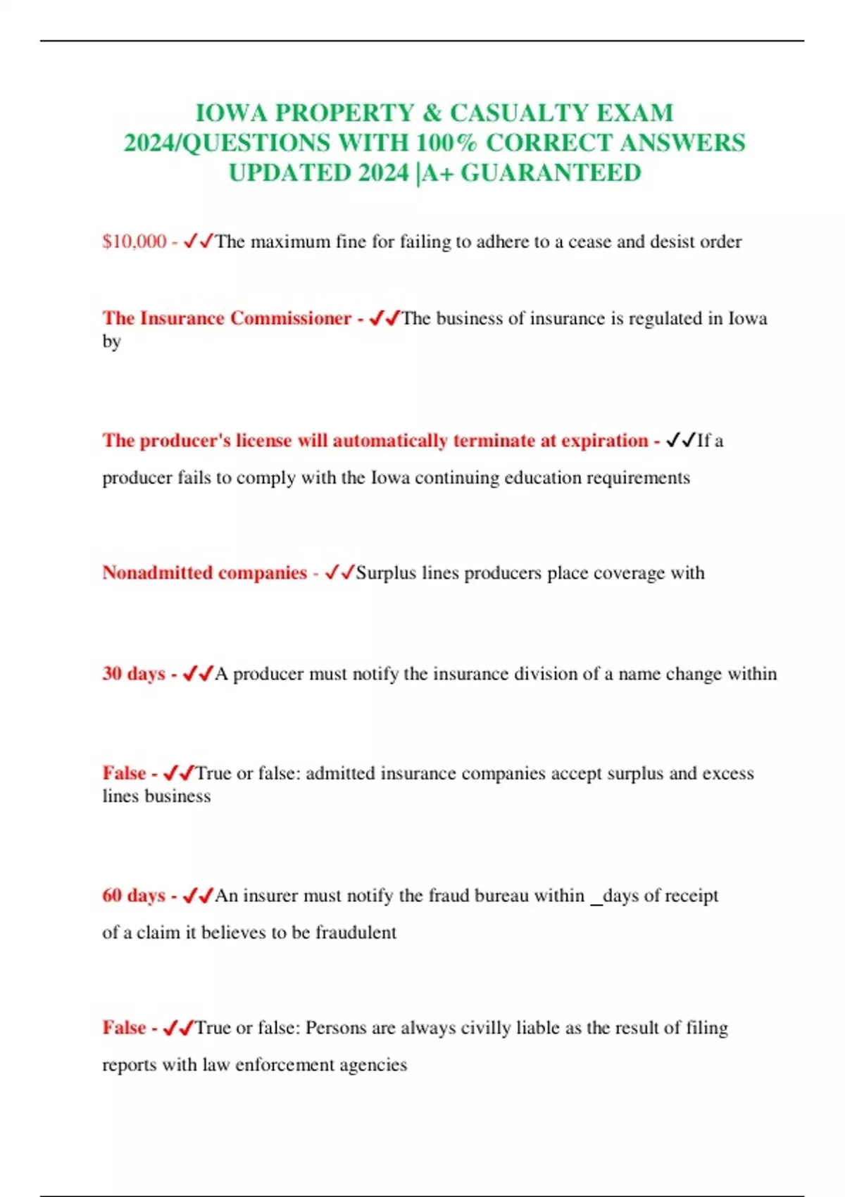 IOWA PROPERTY & CASUALTY EXAM 2024/QUESTIONS WITH 100% CORRECT ANSWERS UPDATED 2024 |A+ GUARANTEED
