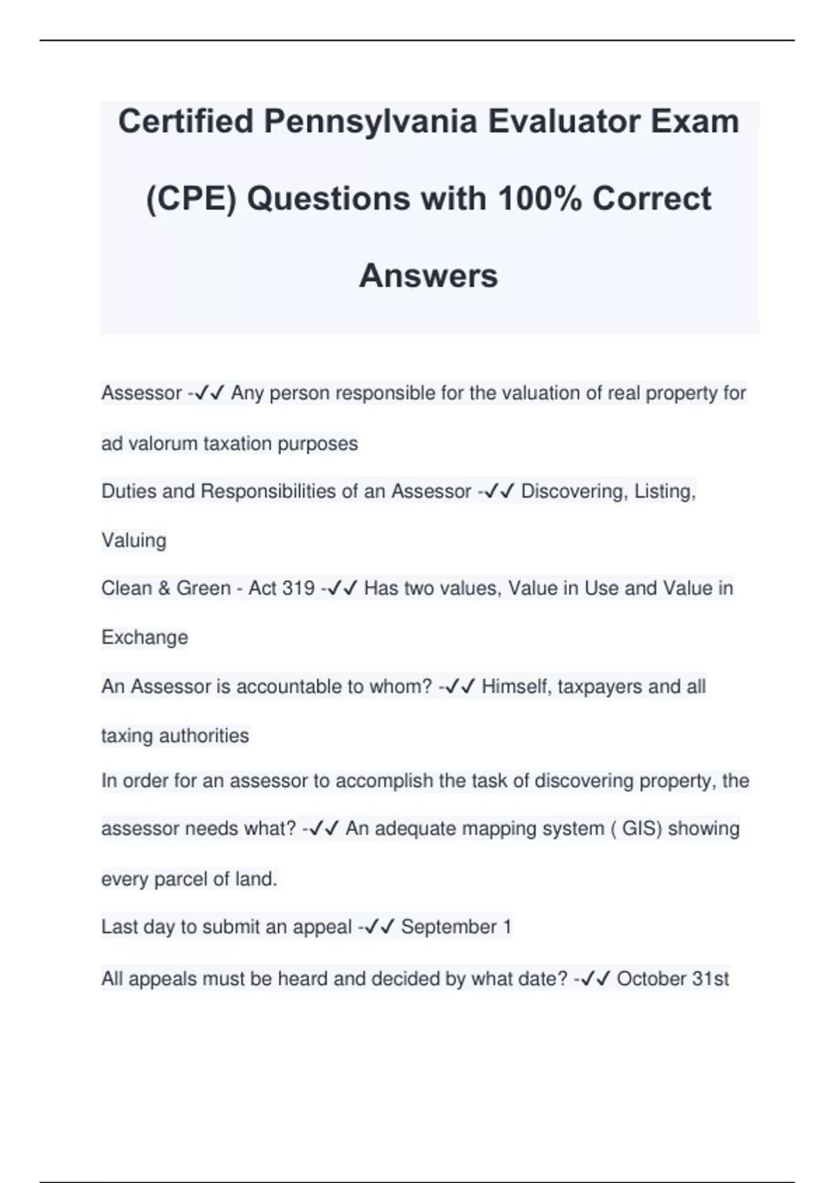 Certified Pennsylvania Evaluator Exam (CPE) Questions with 100% Correct Answers Assessor - Any person responsible for the valuation of real property for ad valorum taxation purposes Duties and Responsibilities of an Assessor - Discovering, Listing, Valuing Clean & Green - Act 319 - Has two values, Value in Use and Value in Exchange An Assessor is accountable to whom? - Himself, taxpayers and all taxing authorities In order for an assessor to accomplish the task of discovering property, the assessor needs what? - An adequate mapping system ( GIS) showing every parcel of land. Last day to submit an appeal - September 1 All appeals must be heard and decided by what date? - October 31st