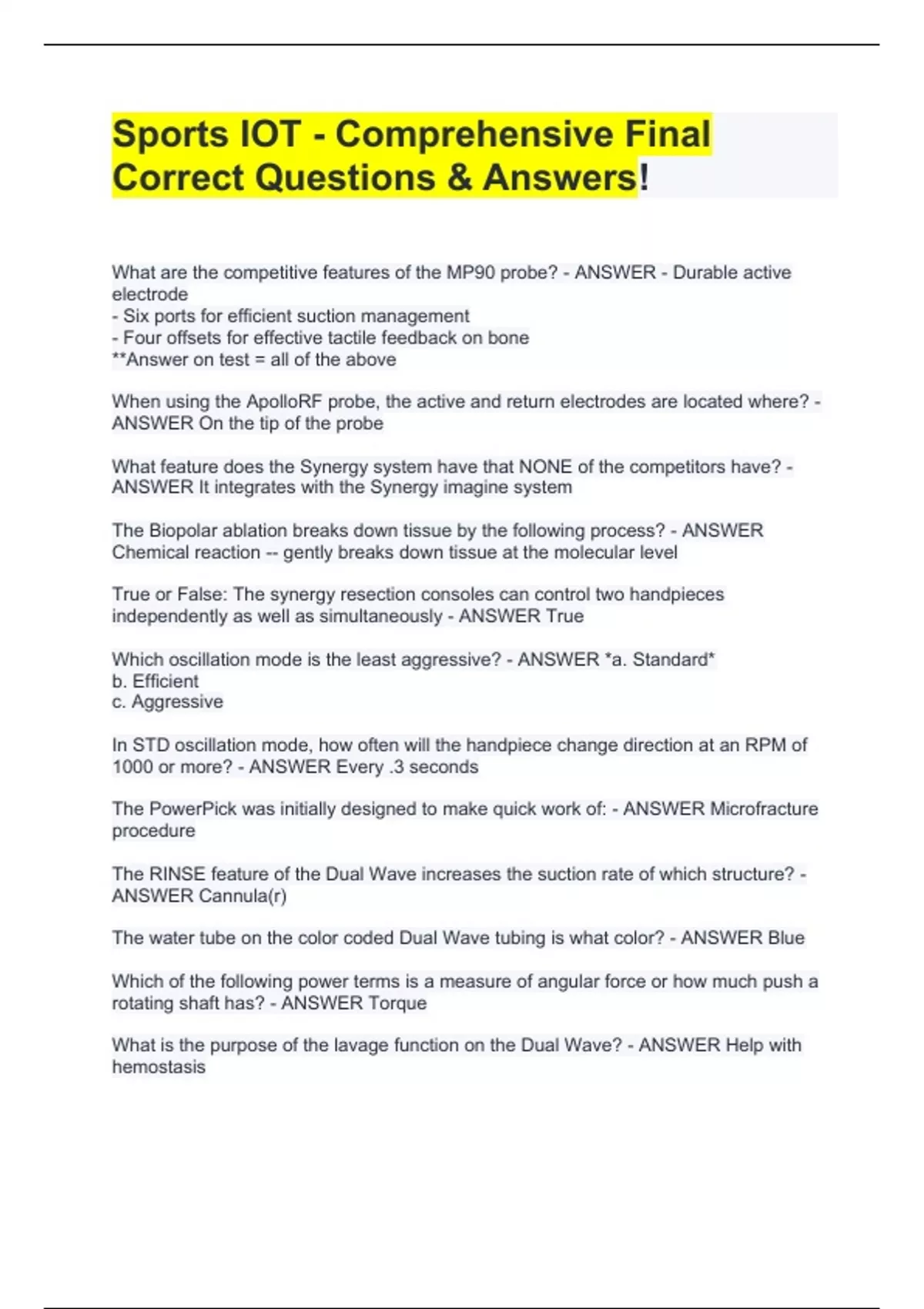 What are the competitive features of the MP90 probe? - ANSWER - Durable active electrode - Six ports for efficient suction management - Four offsets for effective tactile feedback on bone **Answer on test = all of the above When using the ApolloRF probe, the active and return electrodes are located where? - ANSWER On the tip of the probe What feature does the Synergy system have that NONE of the competitors have? - ANSWER It integrates with the Synergy imagine system The Biopolar ablation breaks down tissue by the following process? - ANSWER Chemical reaction -- gently breaks down tissue at the molecular level True or False: The synergy resection consoles can control two handpieces independently as well as simultaneously - ANSWER True Which oscillation mode is the least aggressive? - ANSWER *a. Standard* b. Efficient c. Aggressive In STD oscillation mode, how often will the handpiece change direction at an RPM of 1000 or more? - ANSWER Every .3 seconds The PowerPick was initially designed to make quick work of: - ANSWER Microfracture procedure The RINSE feature of the Dual Wave increases the suction rate of which structure? - ANSWER Cannula(r) The water tube on the color coded Dual Wave tubing is what color? - ANSWER Blue Which of the following power terms is a measure of angular force or how much push a rotating shaft has? - ANSWER Torque What is the purpose of the lavage function on the Dual Wave? - ANSWER Help with hemostasis