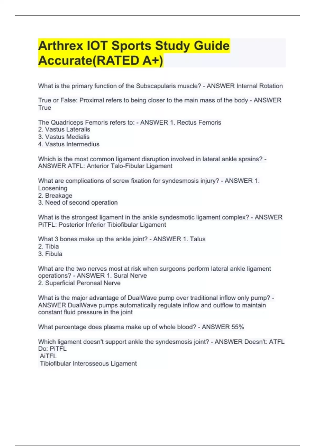 What is the primary function of the Subscapularis muscle? - ANSWER Internal Rotation True or False: Proximal refers to being closer to the main mass of the body - ANSWER True The Quadriceps Femoris refers to: - ANSWER 1. Rectus Femoris 2. Vastus Lateralis 3. Vastus Medialis 4. Vastus Intermedius Which is the most common ligament disruption involved in lateral ankle sprains? - ANSWER ATFL: Anterior Talo-Fibular Ligament What are complications of screw fixation for syndesmosis injury? - ANSWER 1. Loosening 2. Breakage 3. Need of second operation What is the strongest ligament in the ankle syndesmotic ligament complex? - ANSWER PiTFL: Posterior Inferior Tibiofibular Ligament What 3 bones make up the ankle joint? - ANSWER 1. Talus 2. Tibia 3. Fibula What are the two nerves most at risk when surgeons perform lateral ankle ligament operations? - ANSWER 1. Sural Nerve 2. Superficial Peroneal Nerve What is the major advantage of DualWave pump over traditional inflow only pump? - ANSWER DualWave pumps automatically regulate inflow and outflow to maintain constant fluid pressure in the joint What percentage does plasma make up of whole blood? - ANSWER 55% Which ligament doesn't support ankle the syndesmosis joint? - ANSWER Doesn't: ATFL Do: PiTFL AiTFL Tibiofibular Interosseous Ligament