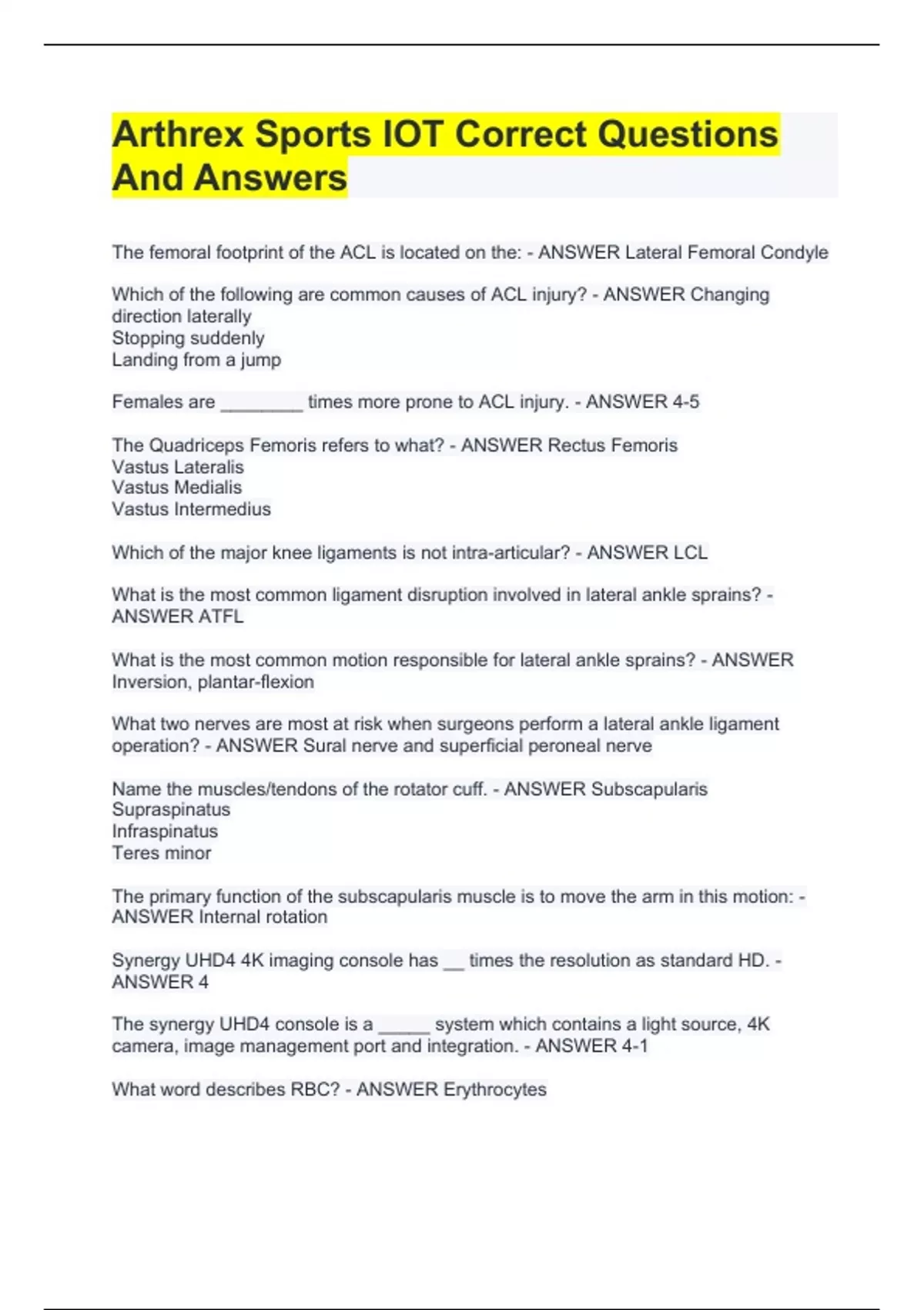 The femoral footprint of the ACL is located on the: - ANSWER Lateral Femoral Condyle Which of the following are common causes of ACL injury? - ANSWER Changing direction laterally Stopping suddenly Landing from a jump Females are ________ times more prone to ACL injury. - ANSWER 4-5 The Quadriceps Femoris refers to what? - ANSWER Rectus Femoris Vastus Lateralis Vastus Medialis Vastus Intermedius Which of the major knee ligaments is not intra-articular? - ANSWER LCL What is the most common ligament disruption involved in lateral ankle sprains? - ANSWER ATFL What is the most common motion responsible for lateral ankle sprains? - ANSWER Inversion, plantar-flexion What two nerves are most at risk when surgeons perform a lateral ankle ligament operation? - ANSWER Sural nerve and superficial peroneal nerve Name the muscles/tendons of the rotator cuff. - ANSWER Subscapularis Supraspinatus Infraspinatus Teres minor The primary function of the subscapularis muscle is to move the arm in this motion: - ANSWER Internal rotation Synergy UHD4 4K imaging console has __ times the resolution as standard HD. - ANSWER 4 The synergy UHD4 console is a _____ system which contains a light source, 4K camera, image management port and integration. - ANSWER 4-1 What word describes RBC? - ANSWER Erythrocytes _______ are a component of whole blood that do not contain a nucleus, therefore they are not truly cells. - ANSWER Platelets (thrombocytes)