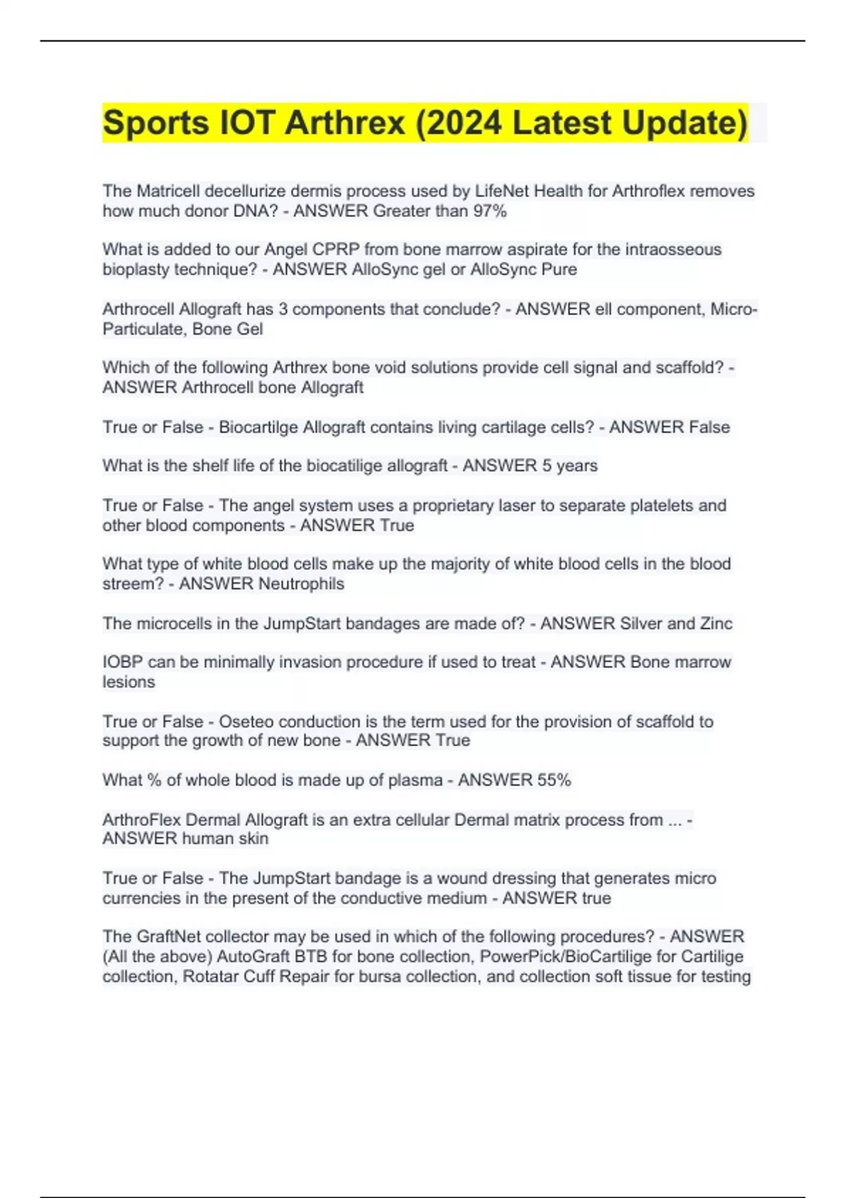 The Matricell decellurize dermis process used by LifeNet Health for Arthroflex removes how much donor DNA? - ANSWER Greater than 97% What is added to our Angel CPRP from bone marrow aspirate for the intraosseous bioplasty technique? - ANSWER AlloSync gel or AlloSync Pure Arthrocell Allograft has 3 components that conclude? - ANSWER ell component, Micro-Particulate, Bone Gel Which of the following Arthrex bone void solutions provide cell signal and scaffold? - ANSWER Arthrocell bone Allograft True or False - Biocartilge Allograft contains living cartilage cells? - ANSWER False What is the shelf life of the biocatilige allograft - ANSWER 5 years True or False - The angel system uses a proprietary laser to separate platelets and other blood components - ANSWER True What type of white blood cells make up the majority of white blood cells in the blood streem? - ANSWER Neutrophils The microcells in the JumpStart bandages are made of? - ANSWER Silver and Zinc IOBP can be minimally invasion procedure if used to treat - ANSWER Bone marrow lesions True or False - Oseteo conduction is the term used for the provision of scaffold to support the growth of new bone - ANSWER True What % of whole blood is made up of plasma - ANSWER 55% ArthroFlex Dermal Allograft is an extra cellular Dermal matrix process from ... - ANSWER human skin True or False - The JumpStart bandage is a wound dressing that generates micro currencies in the present of the conductive medium - ANSWER true The GraftNet collector may be used in which of the following procedures? - ANSWER (All the above) AutoGraft BTB for bone collection, PowerPick/BioCartilige for Cartilige collection, Rotatar Cuff Repair for bursa collection, and collection soft tissue for testing