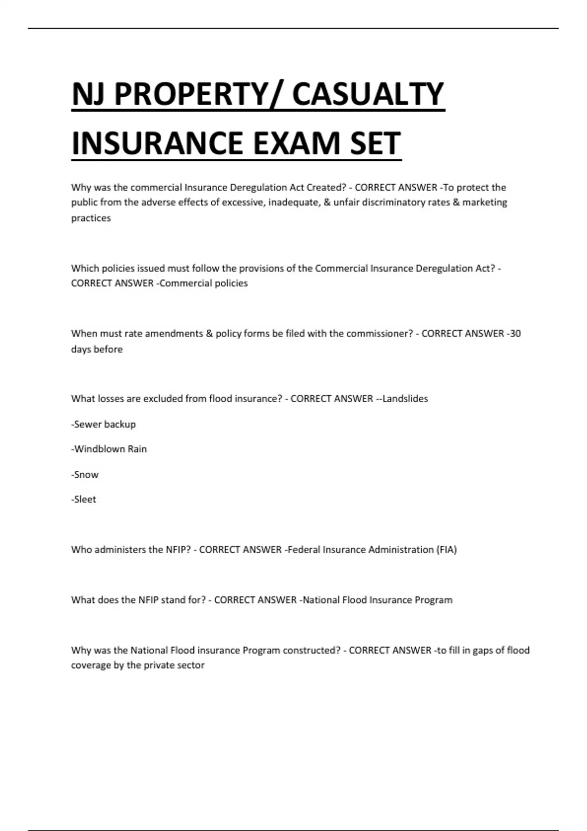 NJ PROPERTY/ CASUALTY INSURANCE EXAM SET Why was the commercial Insurance Deregulation Act Created? - CORRECT ANSWER -To protect the public from the adverse effects of excessive, inadequate, & unfair discriminatory rates & marketing practices Which policies issued must follow the provisions of the Commercial Insurance Deregulation Act? - CORRECT ANSWER -Commercial policies When must rate amendments & policy forms be filed with the commissioner? - CORRECT ANSWER -30 days before What losses are excluded from flood insurance? - CORRECT ANSWER --Landslides -Sewer backup -Windblown Rain -Snow -Sleet Who administers the NFIP? - CORRECT ANSWER -Federal Insurance Administration (FIA) What does the NFIP stand for? - CORRECT ANSWER -National Flood Insurance Program Why was the National Flood insurance Program constructed? - CORRECT ANSWER -to fill in gaps of flood coverage by the private sector