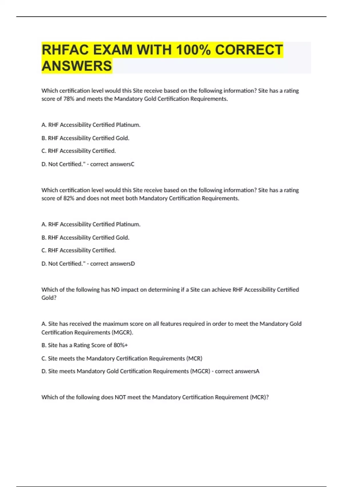 Which certification level would this Site receive based on the following information? Site has a rating score of 78% and meets the Mandatory Gold Certification Requirements. A. RHF Accessibility Certified Platinum. B. RHF Accessibility Certified Gold. C. RHF Accessibility Certified. D. Not Certified." - correct answersC Which certification level would this Site receive based on the following information? Site has a rating score of 82% and does not meet both Mandatory Certification Requirements. A. RHF Accessibility Certified Platinum. B. RHF Accessibility Certified Gold. C. RHF Accessibility Certified. D. Not Certified." - correct answersD Which of the following has NO impact on determining if a Site can achieve RHF Accessibility Certified Gold? A. Site has received the maximum score on all features required in order to meet the Mandatory Gold Certification Requirements (MGCR). B. Site has a Rating Score of 80%+ C. Site meets the Mandatory Certification Requirements (MCR